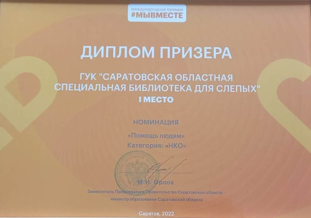Проект «Зримый Саратов», реализуемый ГУК «Областная специальная библиотека для слепых», занял 1 место в региональном этапе международной премии «Мы вместе» в номинации «Помощь людям», категория «НКО».