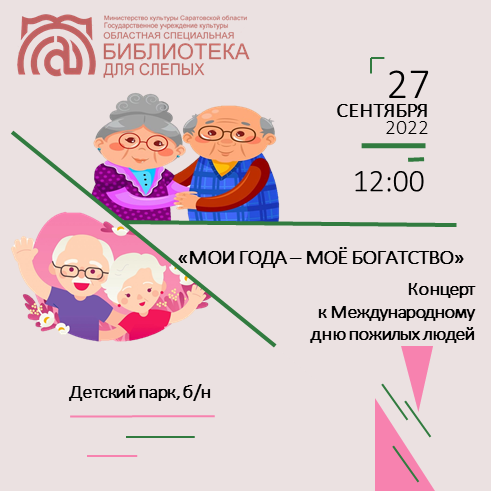 1 октября по решению Генеральной Ассамблеи ООН с 1991 года ежегодно отмечается Международный день пожилых людей. В этот день во внимании находятся люди старшего возраста. Целью Международного дня пожилых людей является привлечение внимания общественности к проблемам людей пожилого возраста, их вкладу в развитие общества, обеспечения людям пожилого возраста независимости, участия в жизни общества. В преддверии Международного дня пожилых людей в Областной специальной библиотеке для слепых в Детском парке пройдёт концерт, посвящённый этому дню.