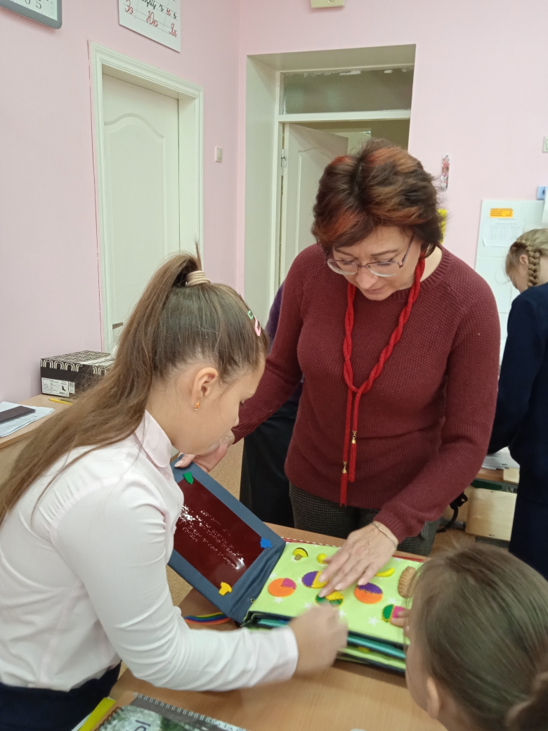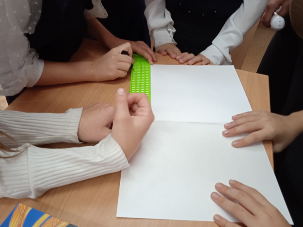 Ученики приняли активное участие в интерактиве: с закрытыми глазами «читали» тактильные изображения, пробовали писать грифелем, используя прибор для письма по Брайлю.
