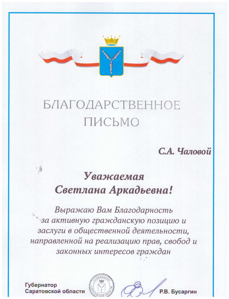 Ведущий библиотекарь библиотечного пункта выдачи передвижного обслуживания г. Балашова Отдела дистанционного и внестационарного обслуживания Областной специальной библиотеки для слепых Светлана Чалова награждена Благодарственным письмом Губернатора Саратовской области.