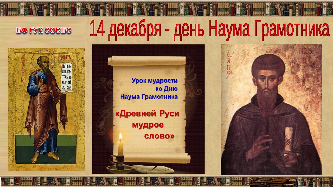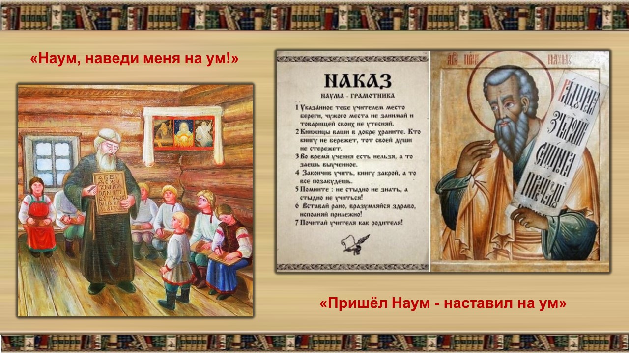 Этот праздник пришёл к нам из глубины веков. Именно в этот день в деревнях на Руси начинался учебный год. Более удачного времени для начала учёбы, когда все основные хозяйственные дела уже были позади, – отыскать трудно. Поэтому день 14 декабря можно назвать и Днём Знаний. А ещё в старину этот день считали Днём Учителя. С давних времён на Руси ценились люди грамотные, знающие. Слово «грамота» означает умение читать и писать. Наум считался покровителем ребят-учеников, покровителем ума, знаний. В поговорках о нём говорили: «Наум, наведи меня на ум!», «Пришёл Наум – наставил на ум». Наши предки издавна придавали большое значение обучению грамоте.