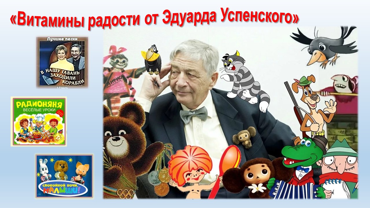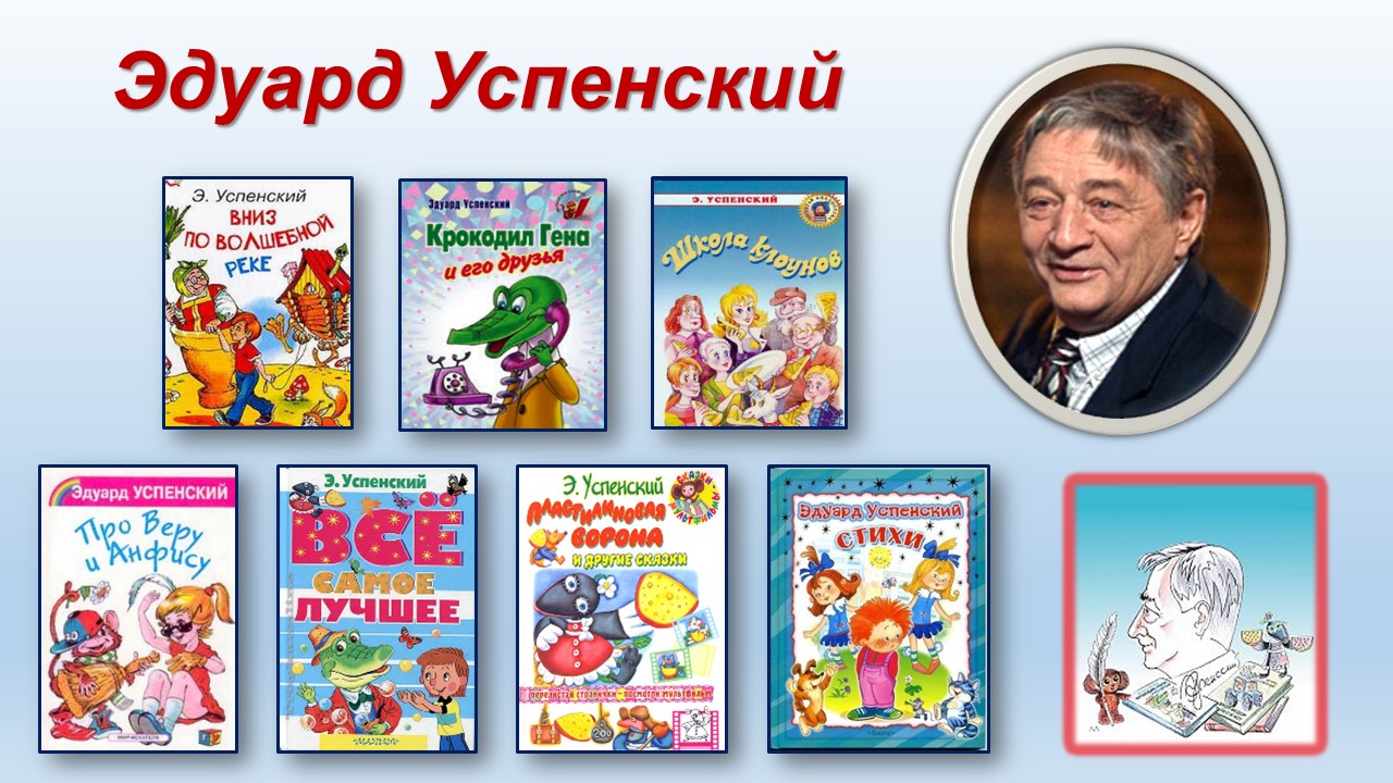 22 декабря исполняется 85 лет со дня рождения замечательного писателя, поэта, драматурга, телеведущего и сценариста Эдуарда Николаевича Успенского (1937-2018), который посвятил своё творчество детям, - автора многих детских книг и песен. Его произведения переведены более чем на 25 языков и изданы в Финляндии, Голландии, Франции, Японии, США. По мотивам произведений Успенского созданы лучшие мультфильмы советской мультипликации. Веселые рассказы и повести Эдуарда Николаевича любят не только дети, но и взрослые. Наверное, каждый знаком с добрым и мудрым крокодилом Геной, наивным Чебурашкой, находчивым почтальоном Печкиным, талантливым котом Матроскиным, непоседливой обезьянкой Анфисой и многими другими персонажами.