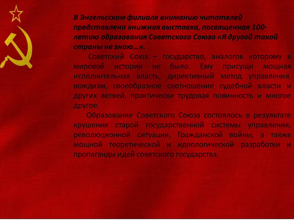 Книжная выставка к 100-летию СССР «Я другой такой страны не знаю»