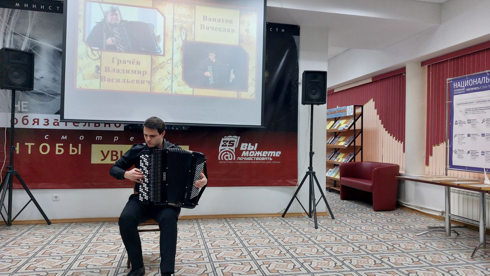 Очень интересно было услышать рассказ о педагоге, профессоре кафедры народных инструментов Саратовской государственной консерватории им. Л.В. Собинова Владимире Васильевиче Грачёве. На сегодняшний день под его руководством обучается множество талантливых музыкантов. Сегодня участники мероприятия встречали ученика профессора В.В. Грачёва Вячеслава Ванатова. В его исполнении изумительно прозвучали произведения – органная прелюдия и фуга соль-минор Иоганна Себастьяна Баха и Блестящие вариации на темы из оперы «Кармен» Жоржа Бизе. Наградой за превосходное исполнение стали продолжительные аплодисменты.