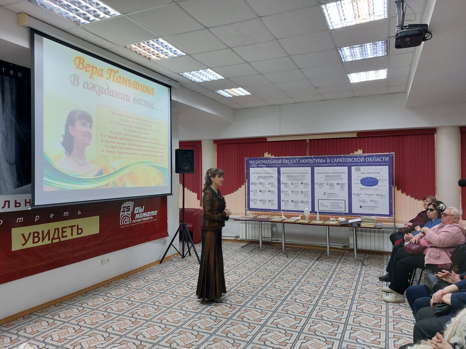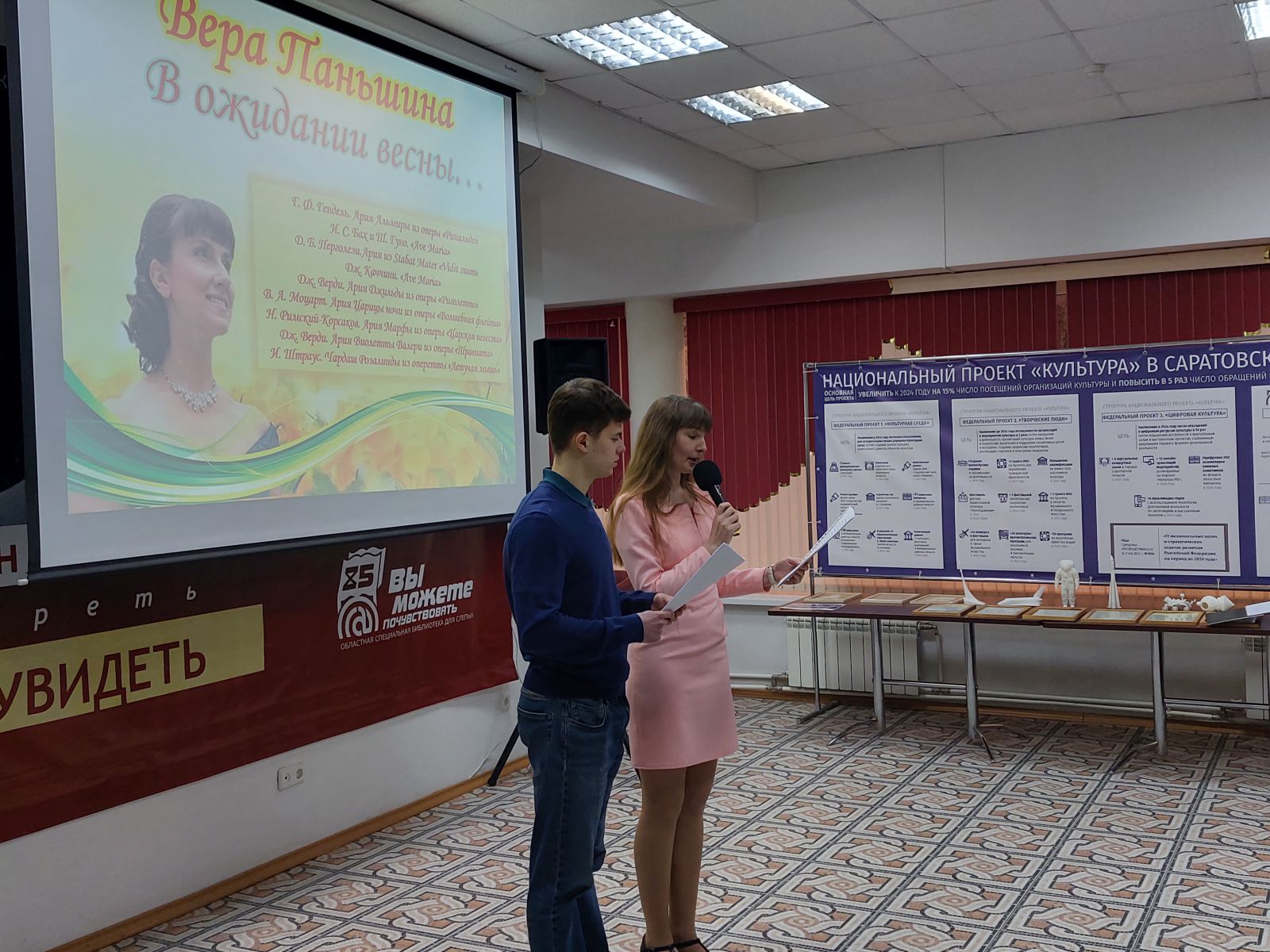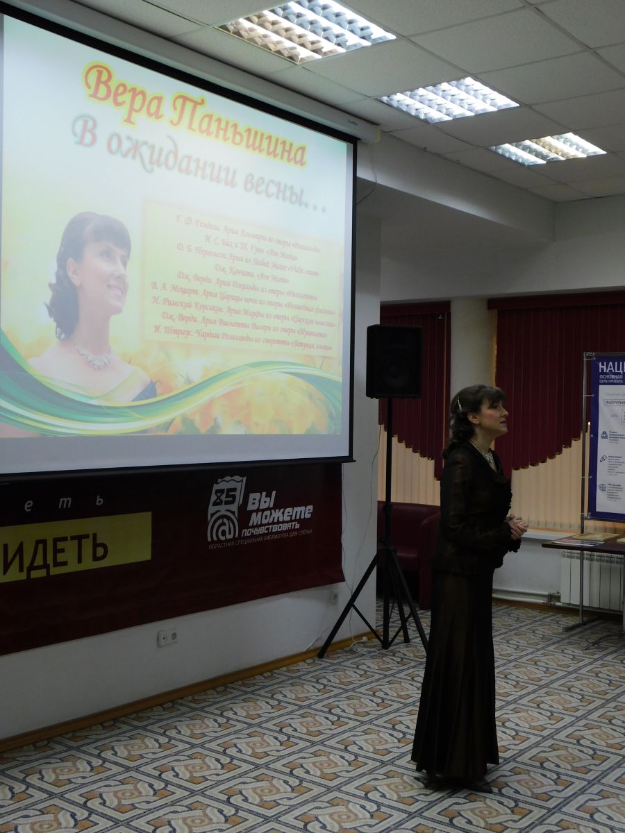27 февраля 2023 года в Областной специальной библиотеке для слепых впервые состоялся сольный концерт солистки Саратовского академического театра оперы и балета Веры Паньшиной «В предчувствии весны…». Для нашей библиотеки это уникальный формат, соединяющий оперное искусство и хорошую литературную основу программы.