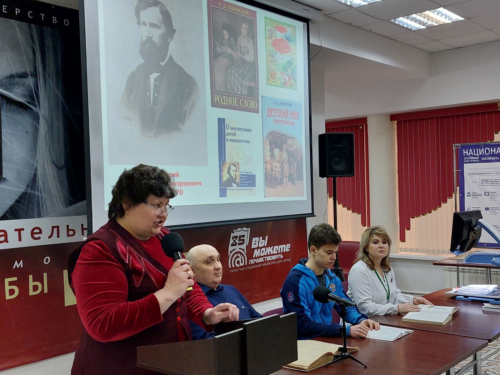 Ведущая Марина Мартынова рассказала присутствующим об акции, познакомила с чтецами. Рассказала о великом русском педагоге, писателе, авторе научной педагогики К.Д. Ушинском. Подробно остановилась на иллюстративно-тактильной книжной выставке, посвященной Году педагога и наставника «Учитель. Педагог. Наставник».