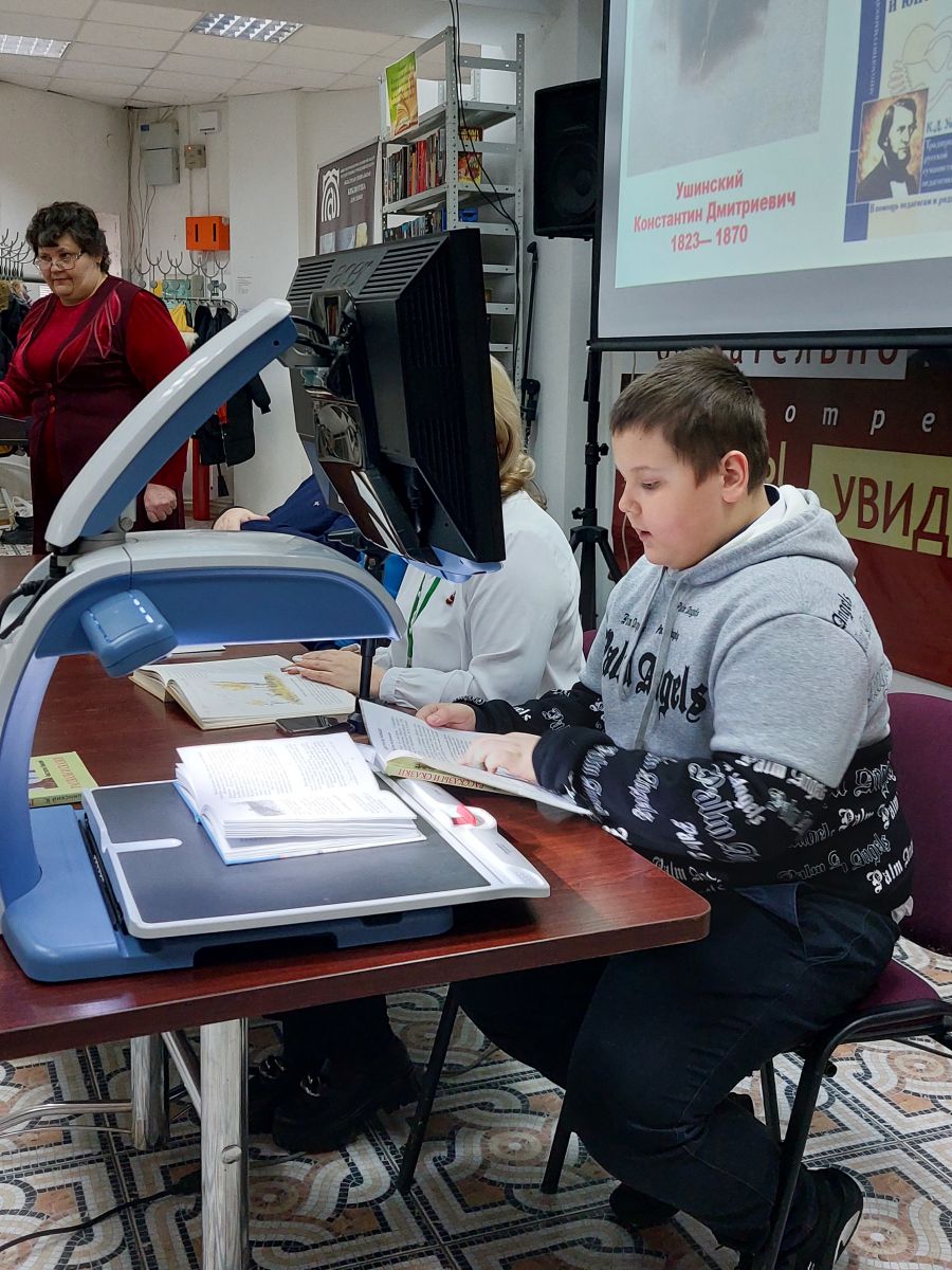 Свои любимые произведения Ушинского участники акции читали вслух в различных форматах: напечатанные обычным плоскопечатным шрифтом; укрупненным шрифтом; слабовидящие читатели при помощи электронного видеоувеличителя; незрячие участники акции читали рельефно-точечным шрифтом Брайля.