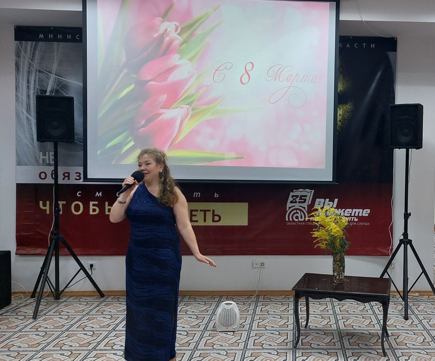 Весна – это запах мимозы. Именно веточками этого красивого и нежного растения был украшен зал массовых мероприятий.