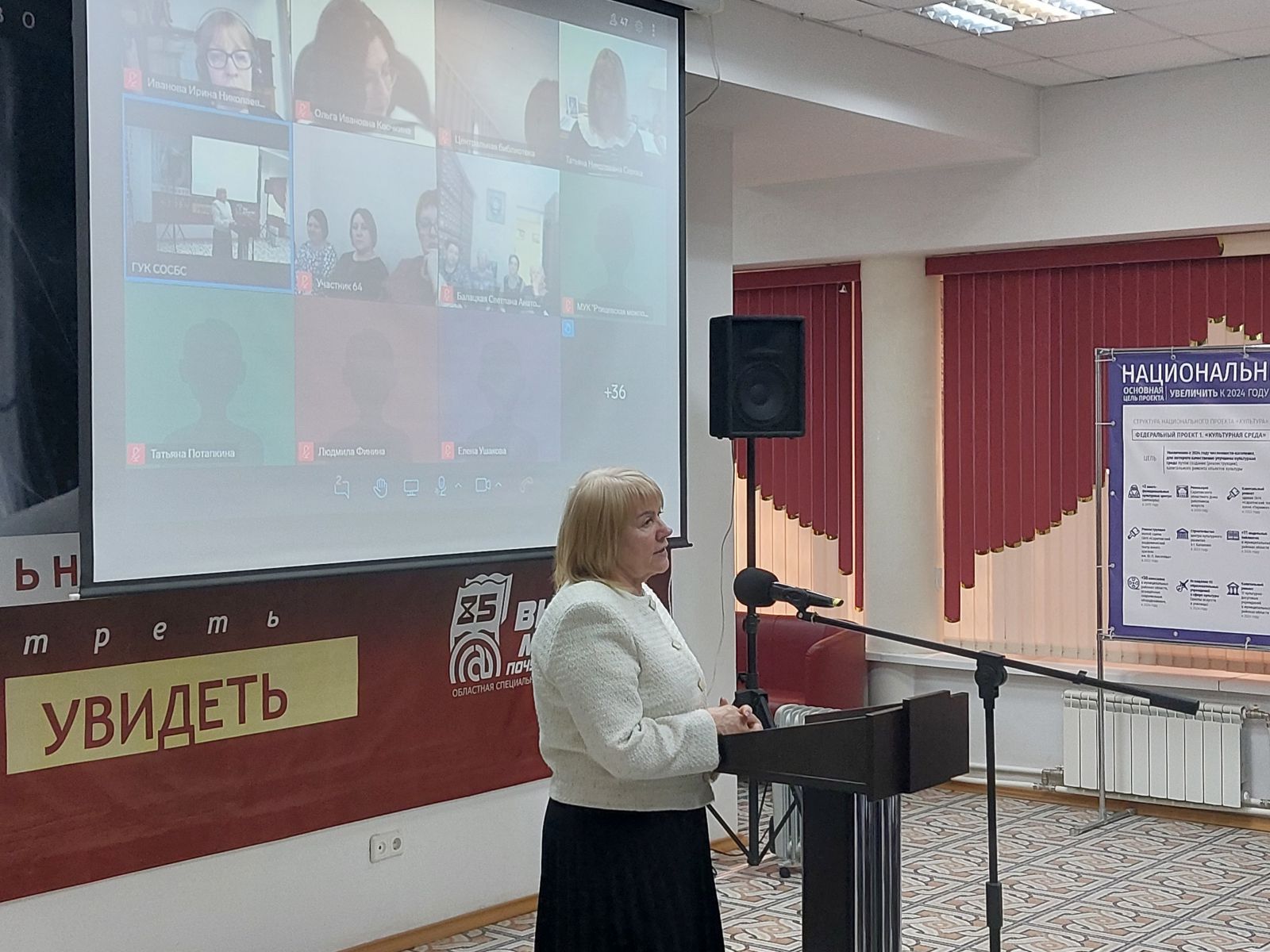 Слова приветствия министра культуры Саратовской области Наталии Юрьевны Щелкановой зачитала директор ГУК «Областная специальная библиотека для слепых» Ольга Ивановна Новикова: «Приветствую Вас, уважаемые участники и организаторы онлайн семинара «Доступность учреждений в сфере культуры для несовершеннолетних». Создание инклюзивного пространства в учреждениях культуры – это наша общая задача, поэтому столь актуальна выбранная для нашей встречи тема. Желаю организаторам и участникам успешной продуктивной работы, результаты которой позволят сделать доступнее для людей с ограниченными возможностями здоровья учреждения культуры региона. Проведение такого семинара на территории ГУК «Областная специальная библиотека для слепых» - большое событие в культурной жизни региона. Уверена, что передача опыта Санкт-Петербургской государственной специальной центральной библиотекой для слепых и слабовидящих несомненно внесёт вклад в улучшение облуживания людей с ОВЗ и создаст стимул для дальнейшей плодотворной работы. Желаю всем здоровья и всего самого наилучшего».