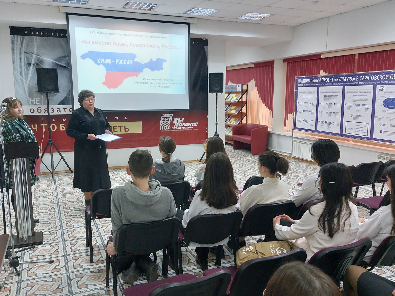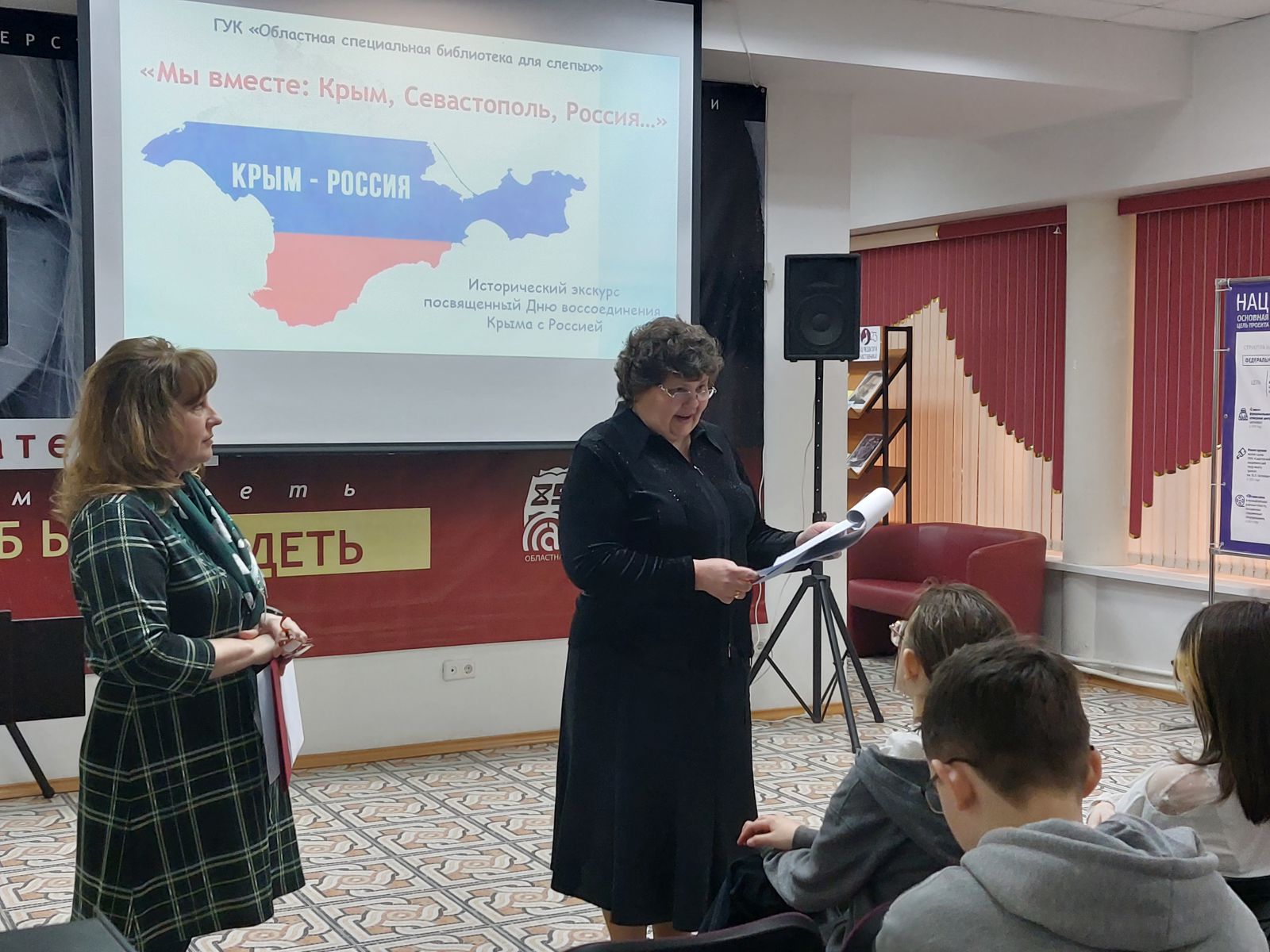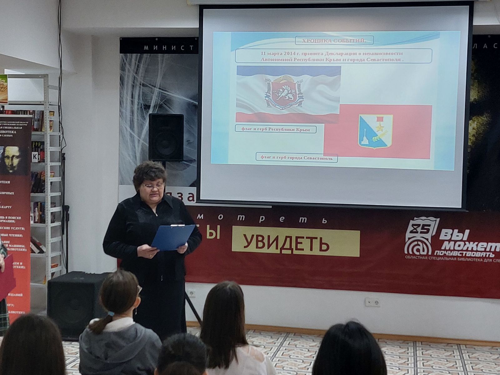 В Областной специальной библиотеке для слепых в Детском парке прошёл исторический экскурс «Мы вместе: Крым, Севастополь, Россия…» ко Дню воссоединения Крыма с Россией.
