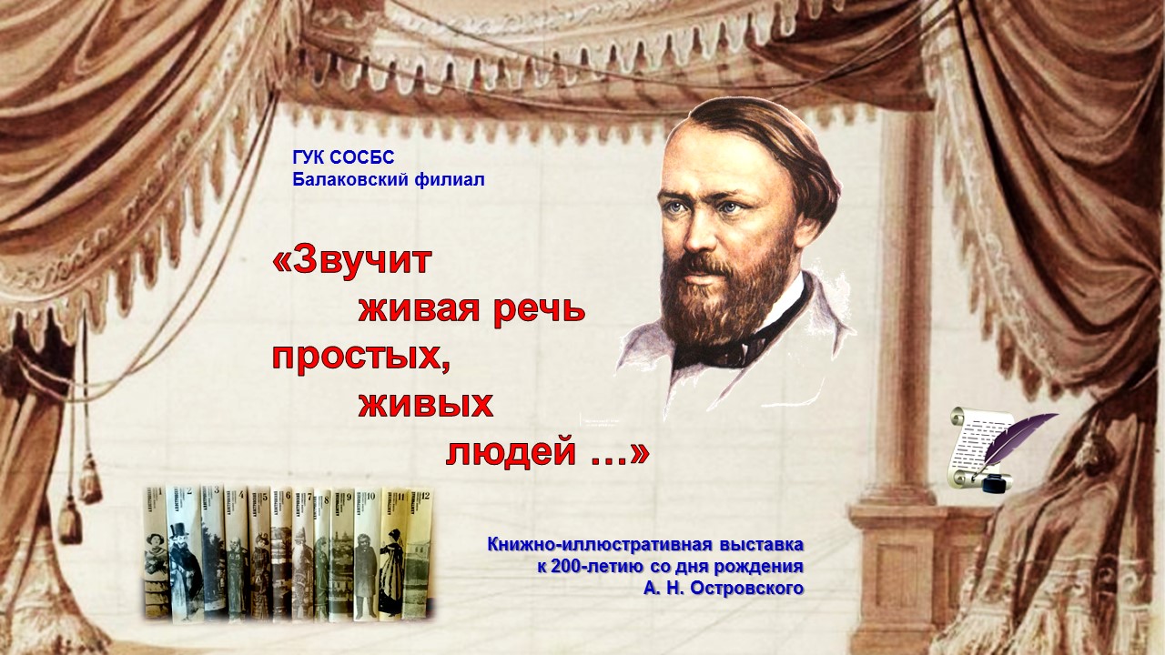 В Балаковском филиале Областной специальной библиотеки для слепых работает книжно-иллюстративная выставка ««Звучит живая речь простых, живых людей…», посвященная 200-летию со дня рождения А. Н. Островского. Выставка представляет художественные произведения выдающегося русского драматурга Александра Николаевича Островского и публицистику, посвященную ему, на разных носителях и разных форматов, а также иллюстрации, аудиозаписи и видеоматериалы.