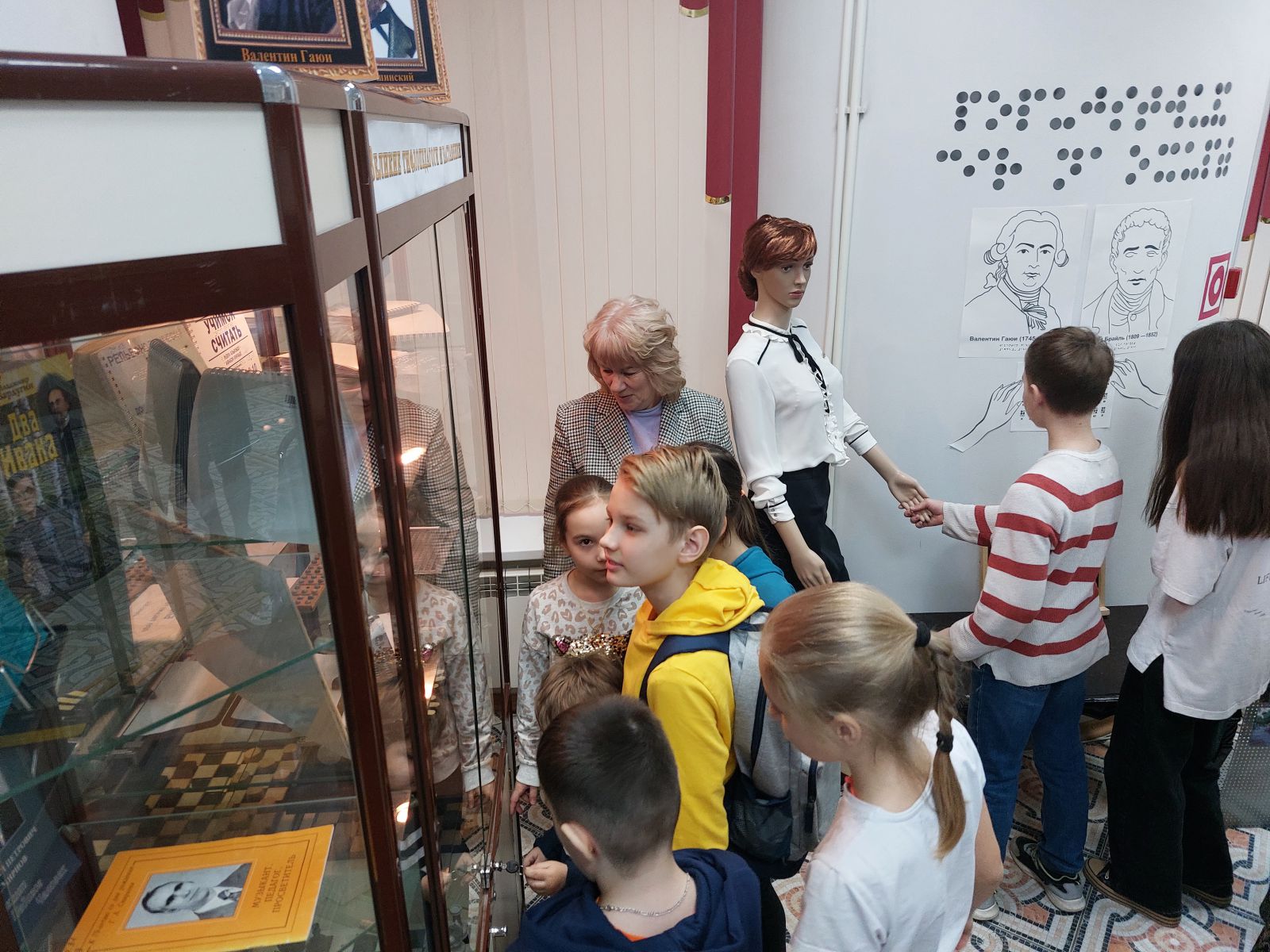 Экскурсия началась в около библиотечном пространстве: знакомство с режимом работы по Брайлю.