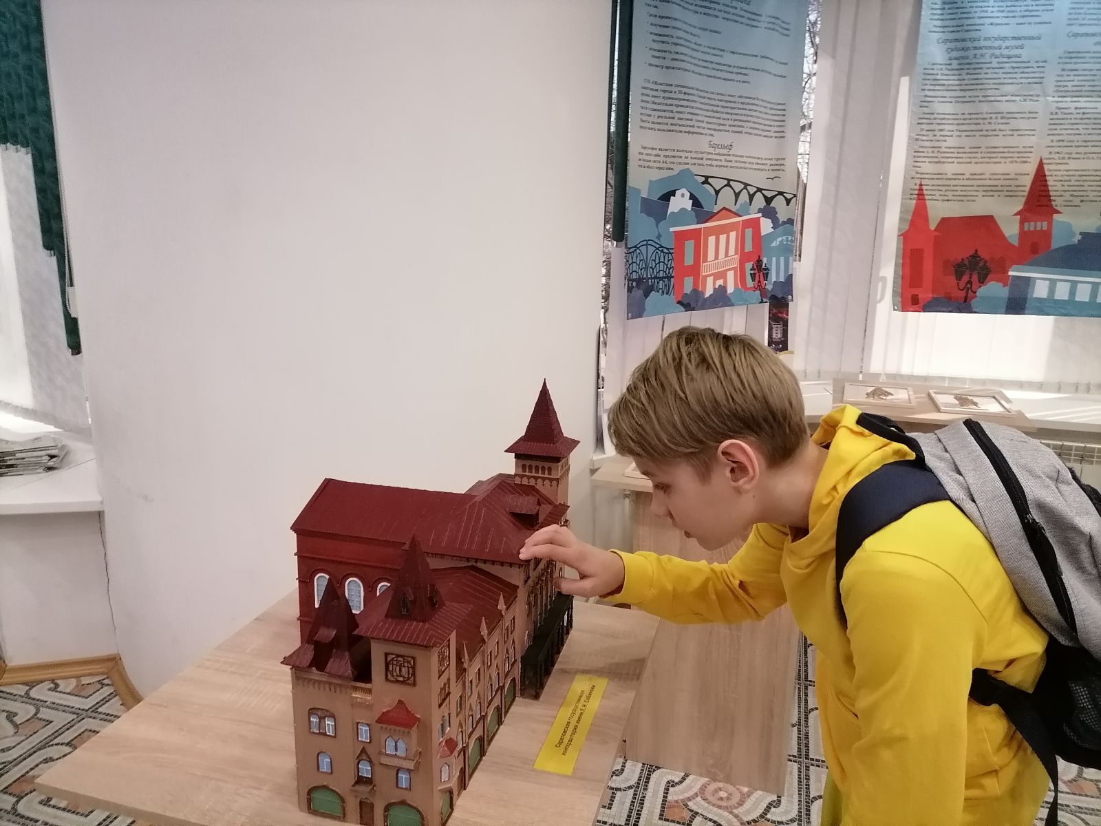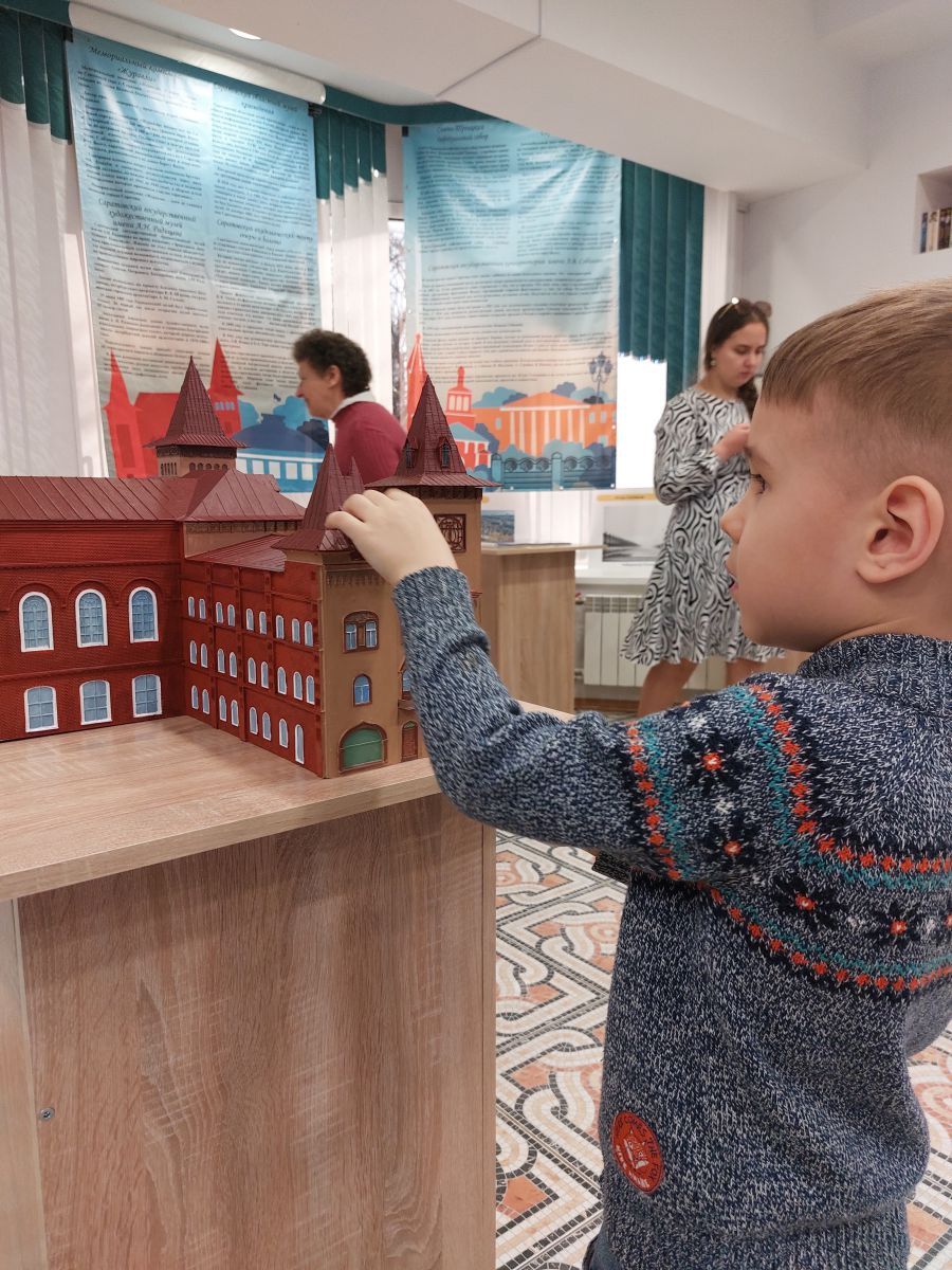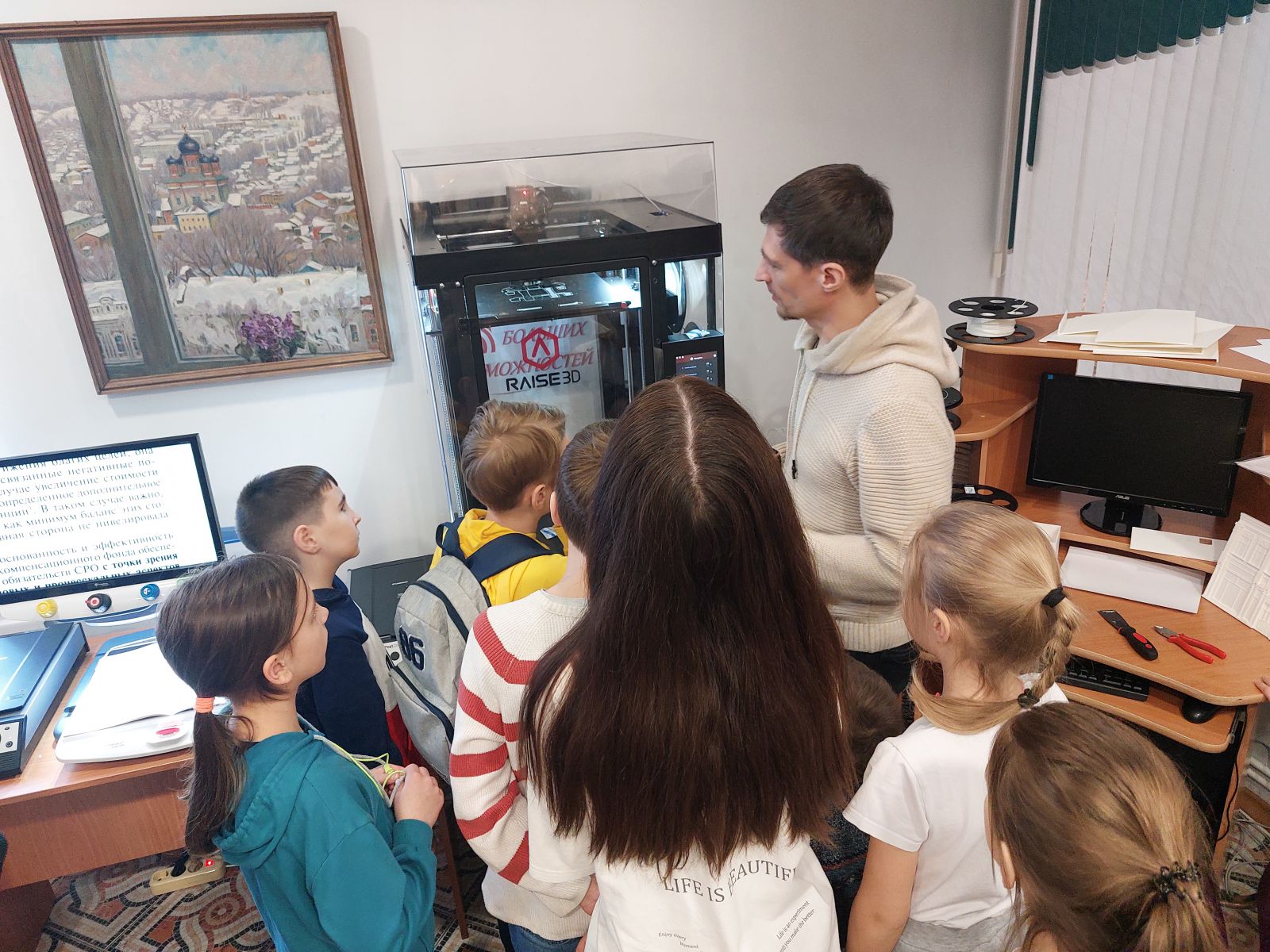 Ребята надолго задержались около 3D принтера и узнали, как создаются макеты архитектурных зданий, в т.ч. и представленных на выставке. Специалисты библиотеки подробно отвечали на множество вопросов о создании макетов на всех этапах – от создания на компьютере до раскрашивания макетов вручную.