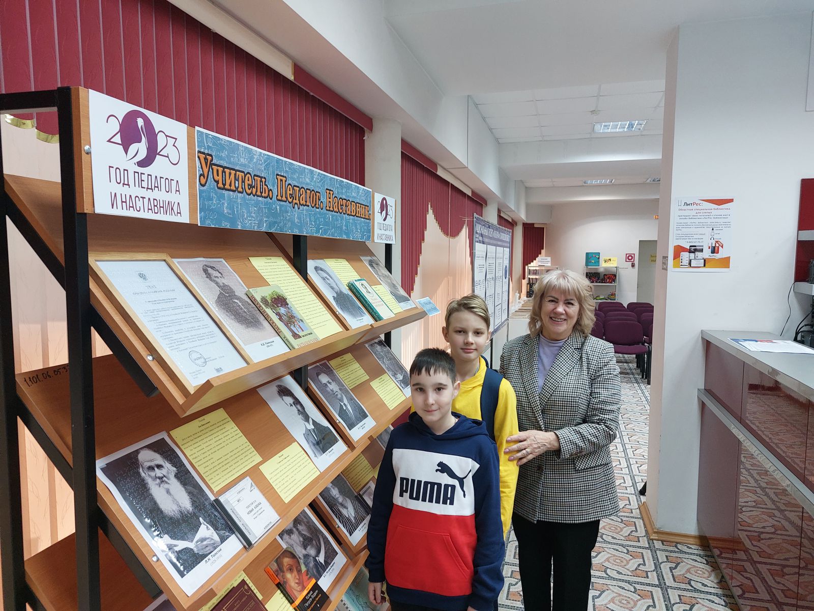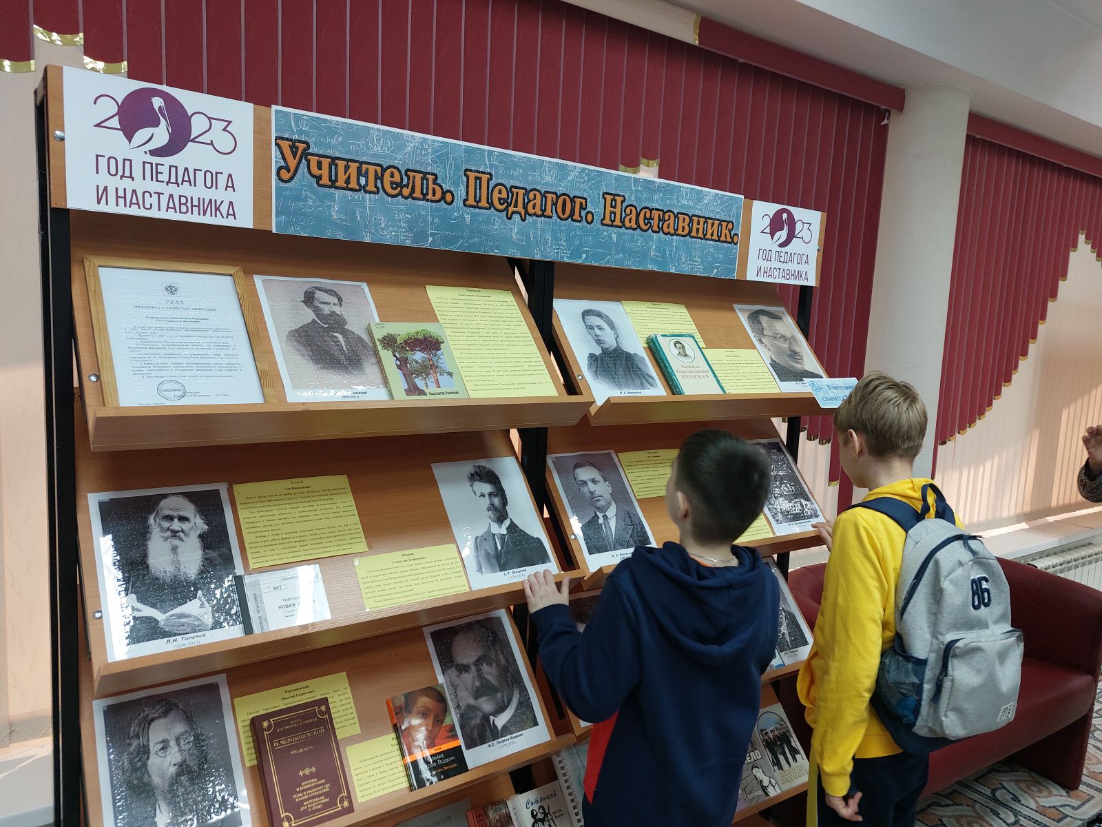 При входе в библиотеку учащихся встречал дружный коллектив библиотеки и сразу ознакомил с выставочным пространством, с тактильной выставкой к Году педагога и наставника.