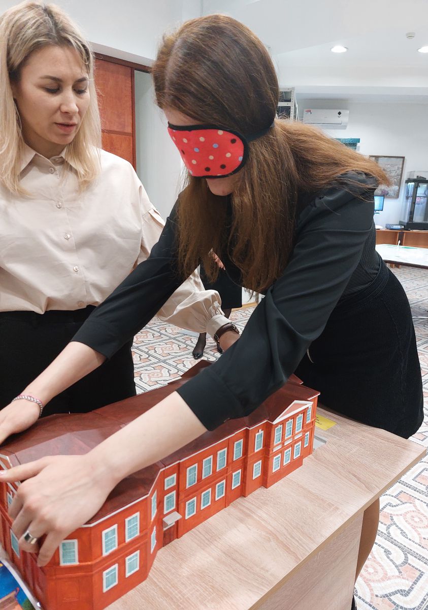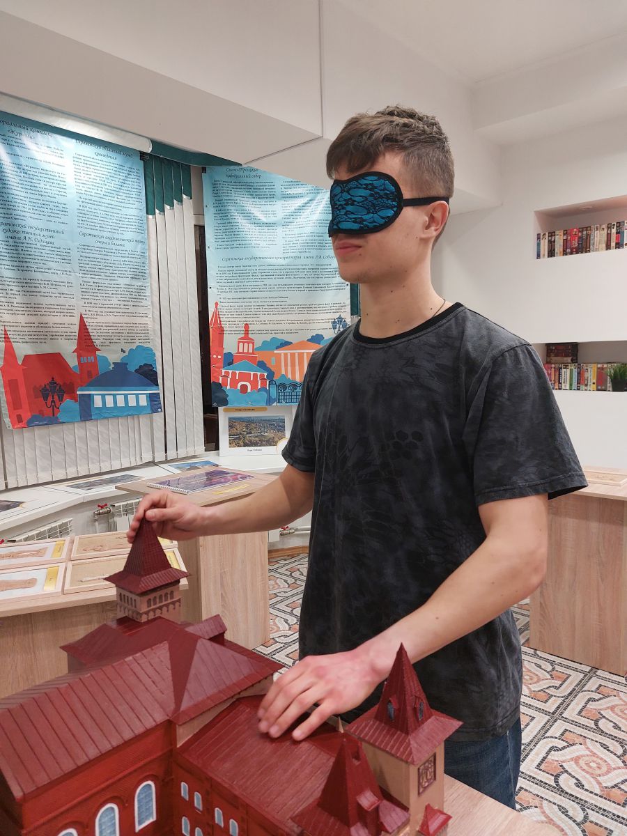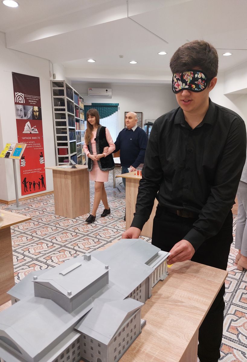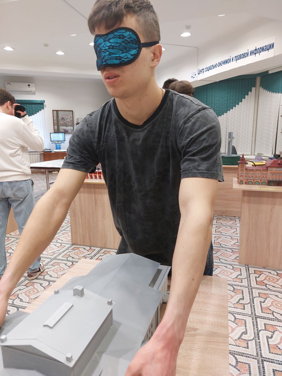 Наступил самый интересный момент – участникам, с их согласия, были выданы повязки на глаза. У каждого был сопровождающий – специалист библиотеки. Двое первых добровольцев перешли в тактильный зал, где расположена передвижная тактильная выставка «Зримый Саратов». Было предложено узнать здания в 3D формате, о которых было подробно рассказано в презентации. Первые добровольцы из семи макетов зданий, которые они «осмотрели» на ощупь, правильно назвали пять. Из всех участников только трое узнали все объекты.