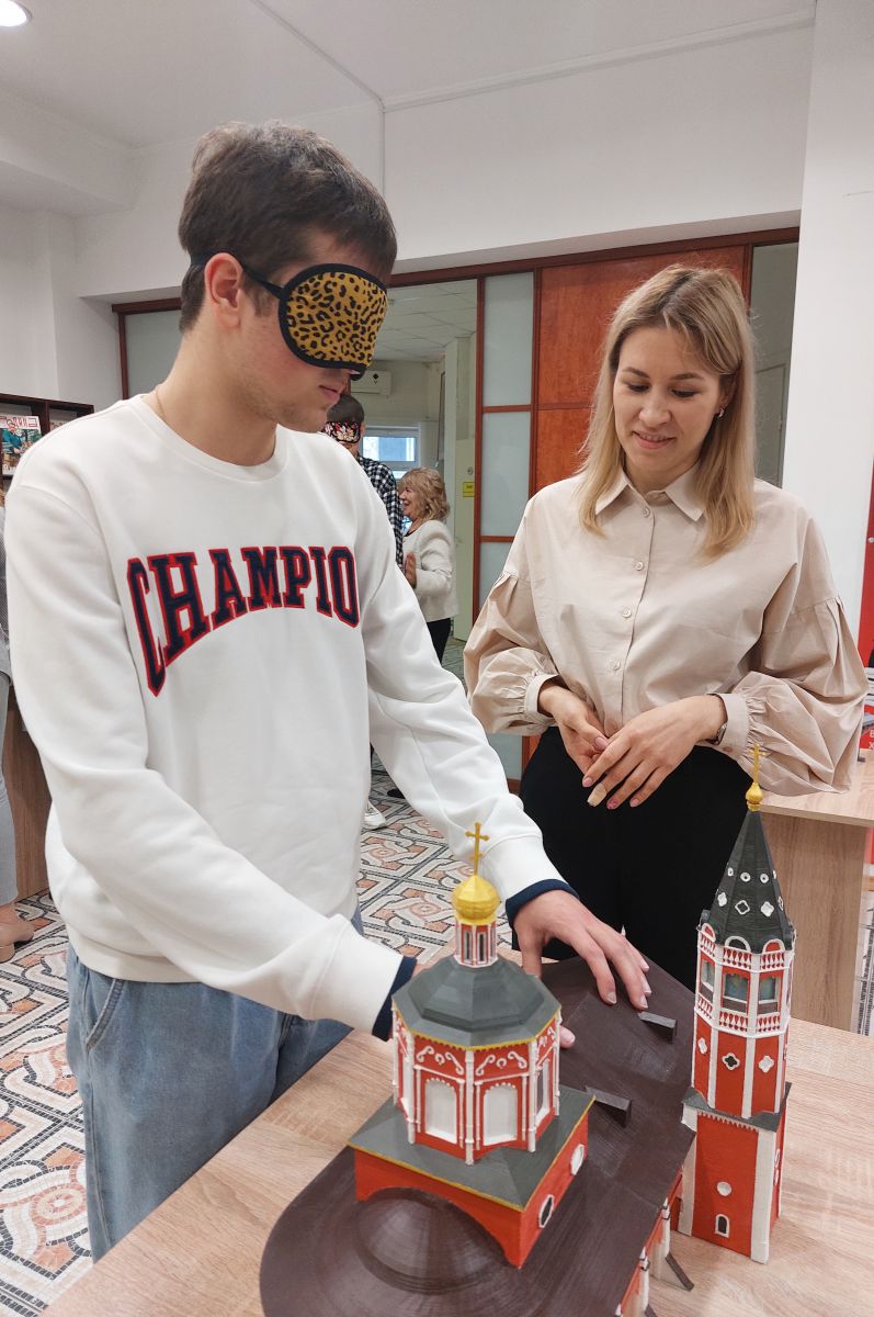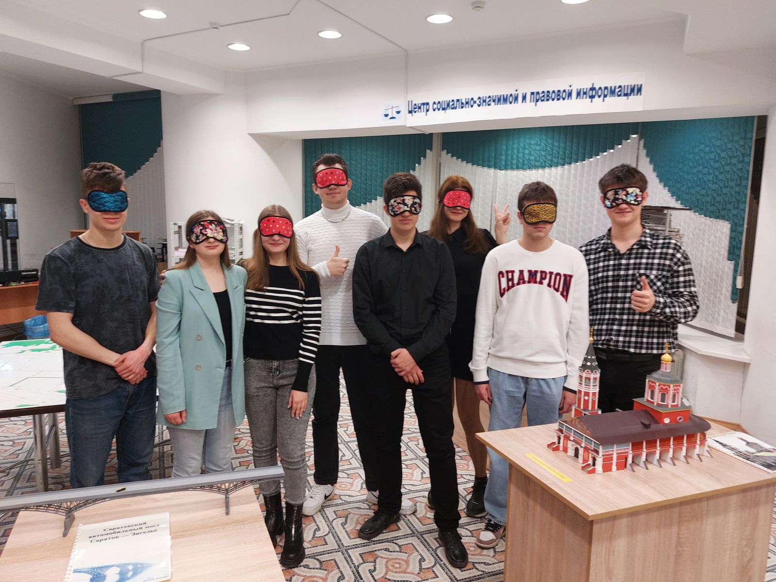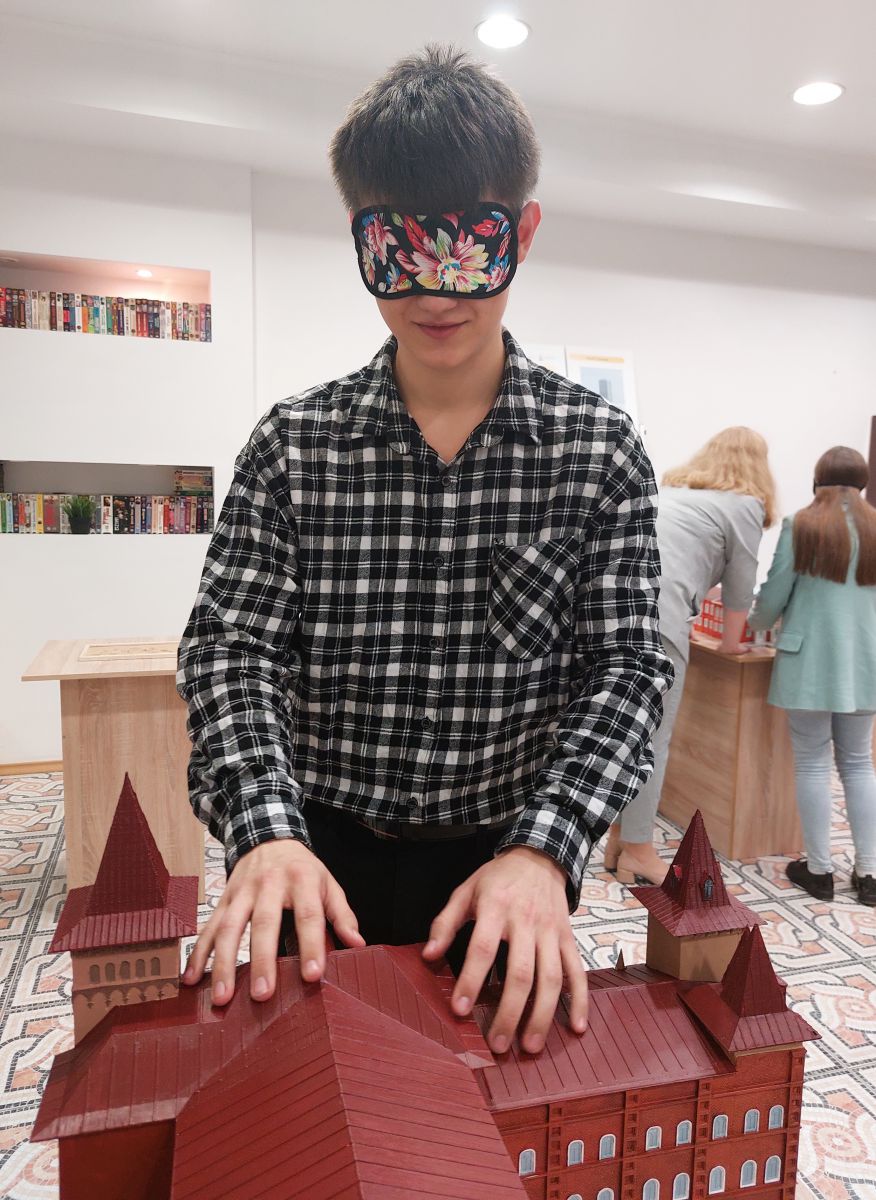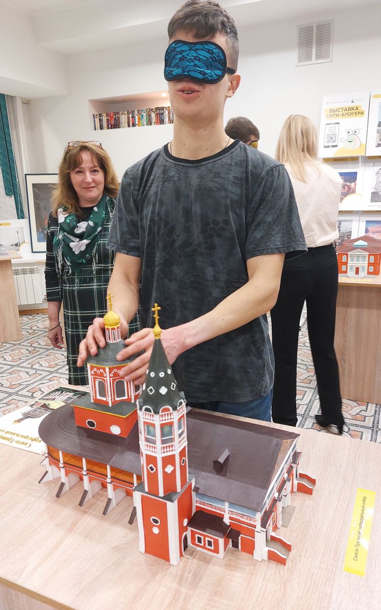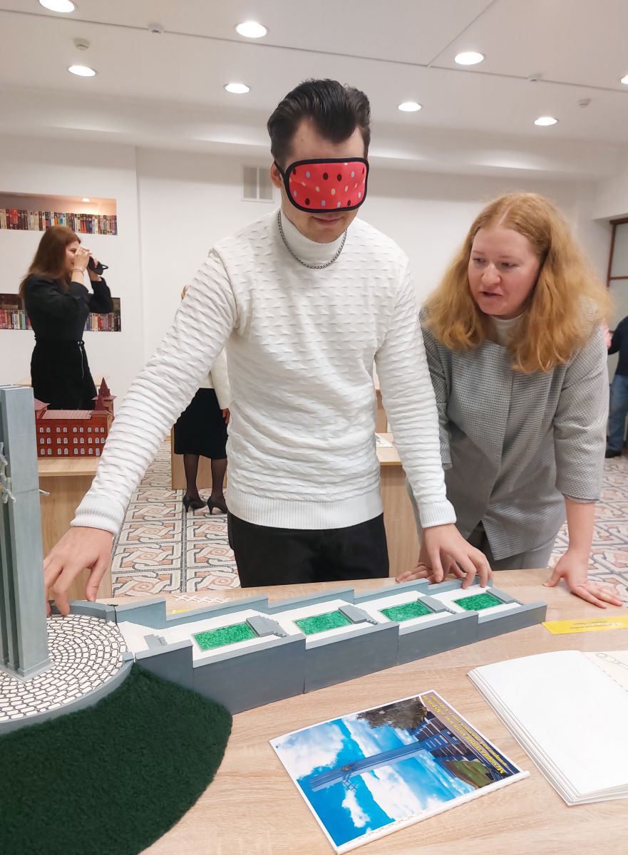 Наступил самый интересный момент – участникам, с их согласия, были выданы повязки на глаза. У каждого был сопровождающий – специалист библиотеки. Двое первых добровольцев перешли в тактильный зал, где расположена передвижная тактильная выставка «Зримый Саратов». Было предложено узнать здания в 3D формате, о которых было подробно рассказано в презентации. Первые добровольцы из семи макетов зданий, которые они «осмотрели» на ощупь, правильно назвали пять. Из всех участников только трое узнали все объекты.