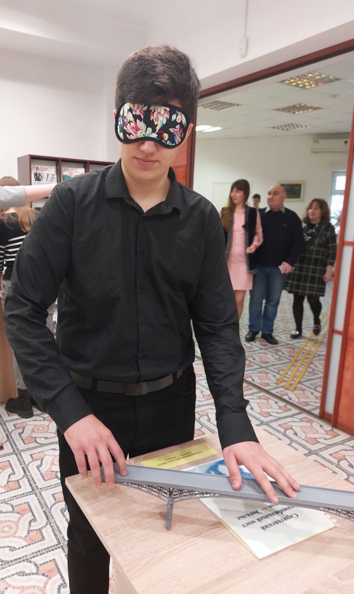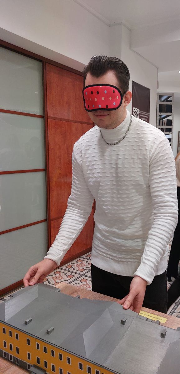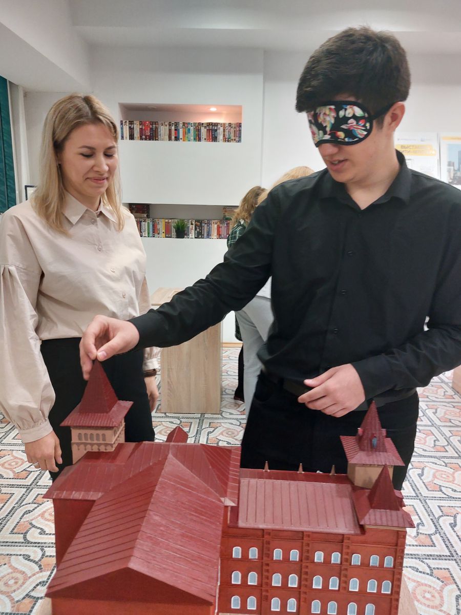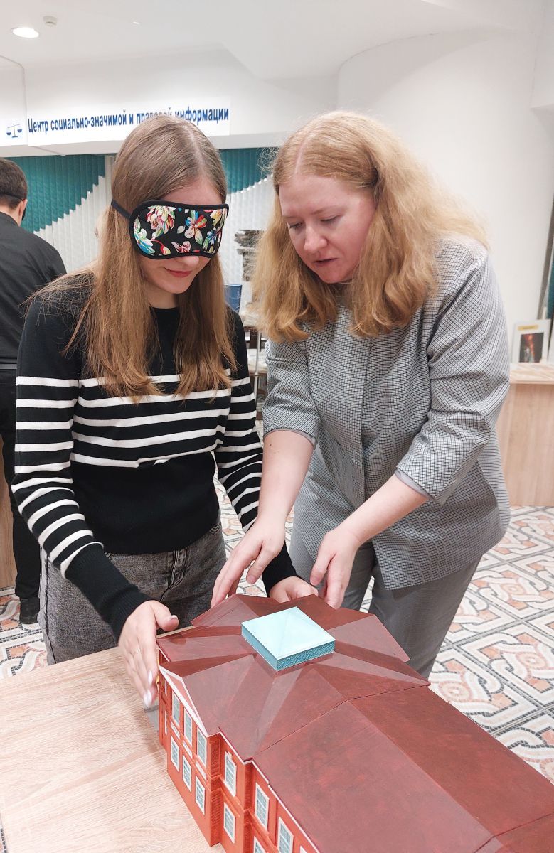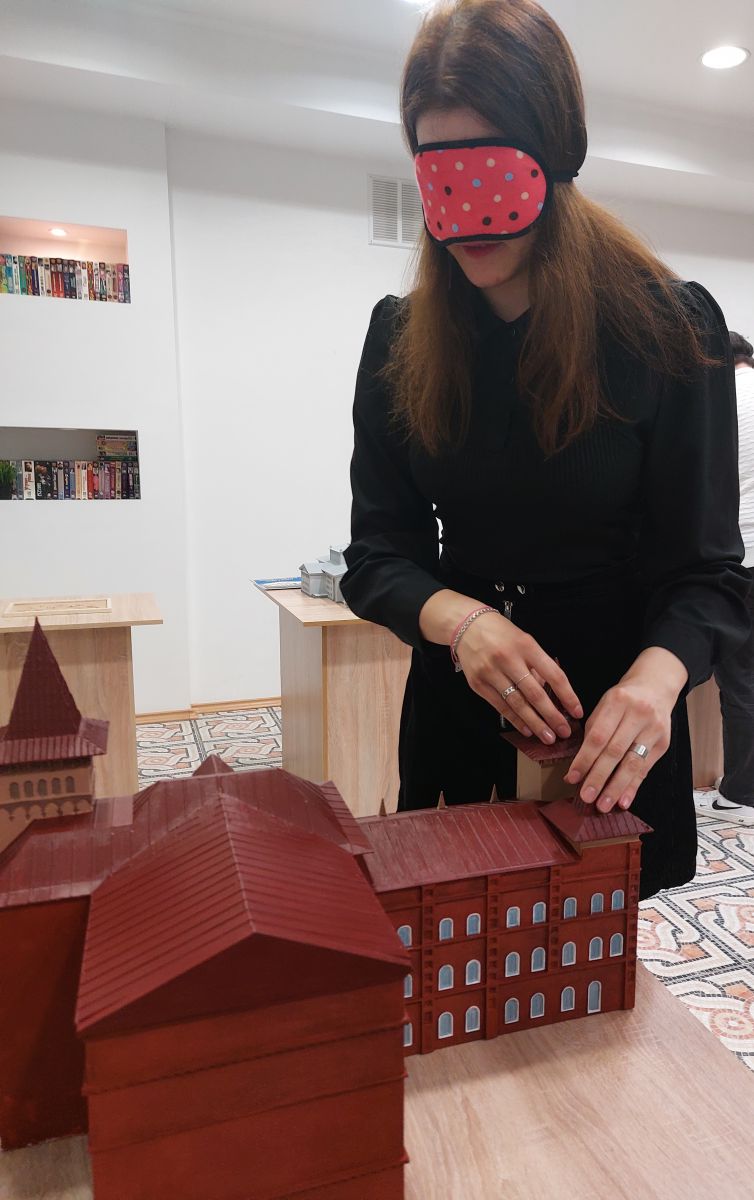 Наступил самый интересный момент – участникам, с их согласия, были выданы повязки на глаза. У каждого был сопровождающий – специалист библиотеки. Двое первых добровольцев перешли в тактильный зал, где расположена передвижная тактильная выставка «Зримый Саратов». Было предложено узнать здания в 3D формате, о которых было подробно рассказано в презентации. Первые добровольцы из семи макетов зданий, которые они «осмотрели» на ощупь, правильно назвали пять. Из всех участников только трое узнали все объекты.