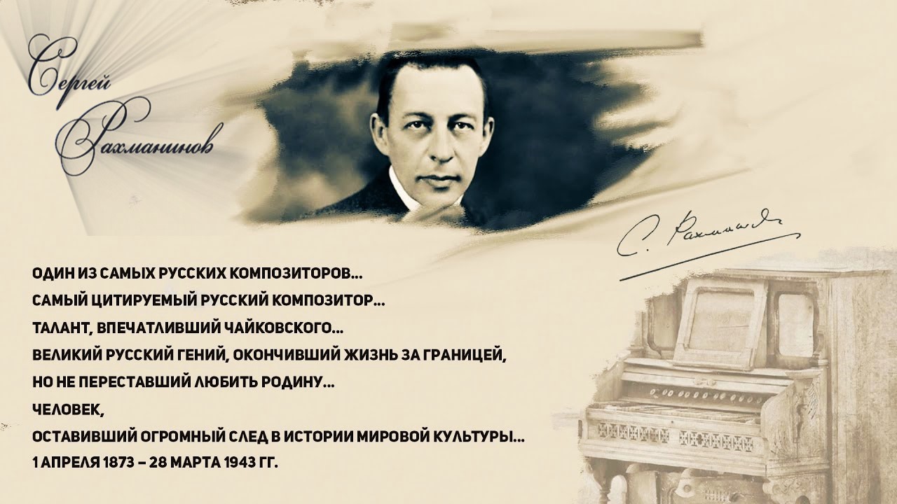 В апреле 2023 года поклонники музыки по всему миру отмечают 150-летие со дня рождения великого русского композитора, пианиста-виртуоза и дирижера Сергея Васильевича Рахманинова (1873-1943). В 2023 году с именем С. В. Рахманинова связано несколько юбилейных дат: 150-летие со дня рождения, 80-летие со дня смерти, 130-летие премьеры первой оперы «Алеко» в Большом театре.