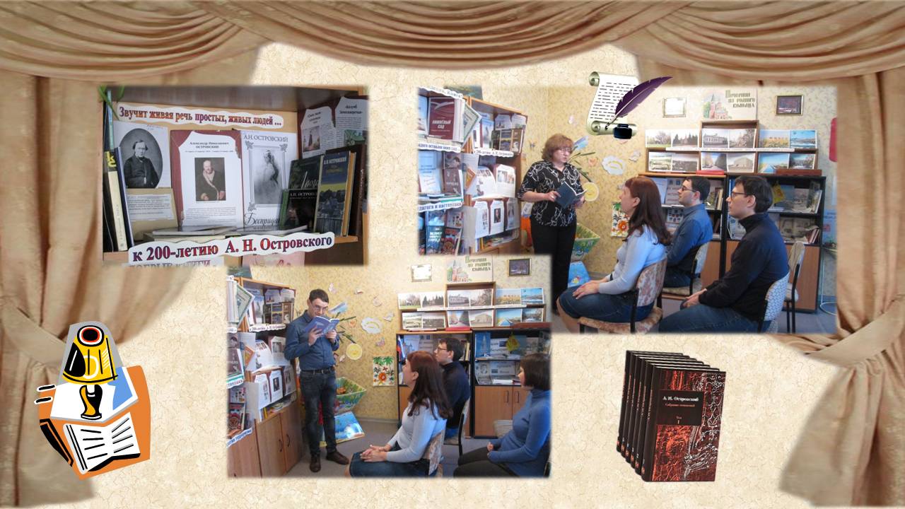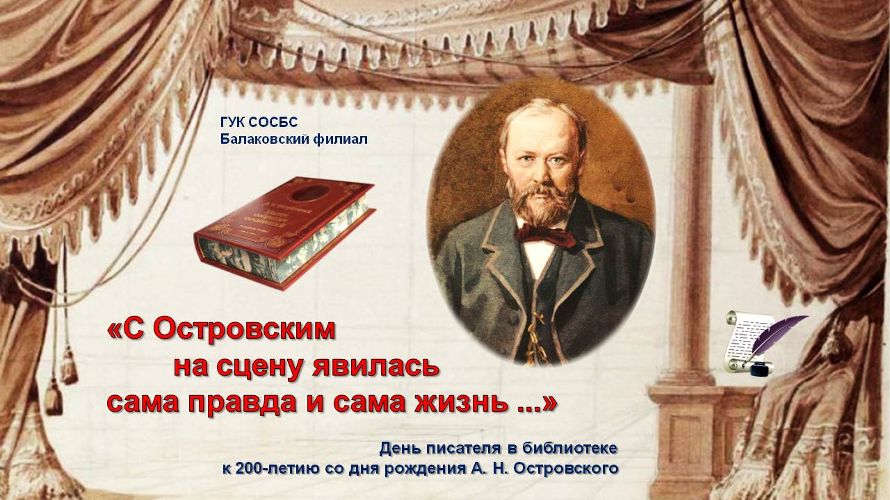 В Балаковском филиале Областной специальной библиотеки для слепых прошел День писателя, посвященный 200-летию со дня рождения Александра Николаевича Островского. Гости библиотеки узнали о жизни и творчестве создателя русского национального театра, произведения которого до сих пор не сходят со сцен театров и телеэкранов. Выставка представила художественные произведения А. Н. Островского и публицистику, посвященную ему, на разных носителях и разных форматов; иллюстрации, аудиозаписи и видеоматериалы. Громкое чтение отрывков из произведений писателя и аудиозаписи помогли «оказаться» в театре времен Островского: великолепный язык гениального драматурга со множеством пословиц и поговорок, а также старых слов; интересные персонажи; жизненные ситуации и проблемы героев его пьес, актуальные и по сей день.
