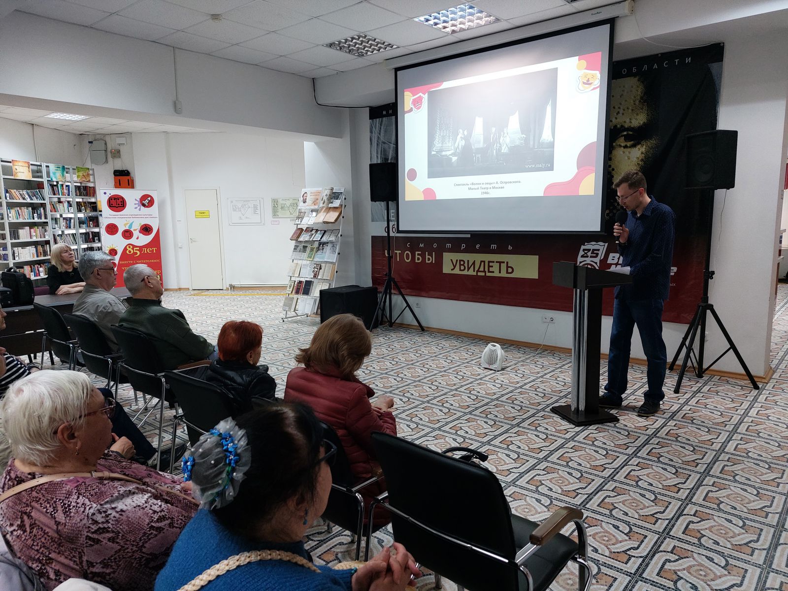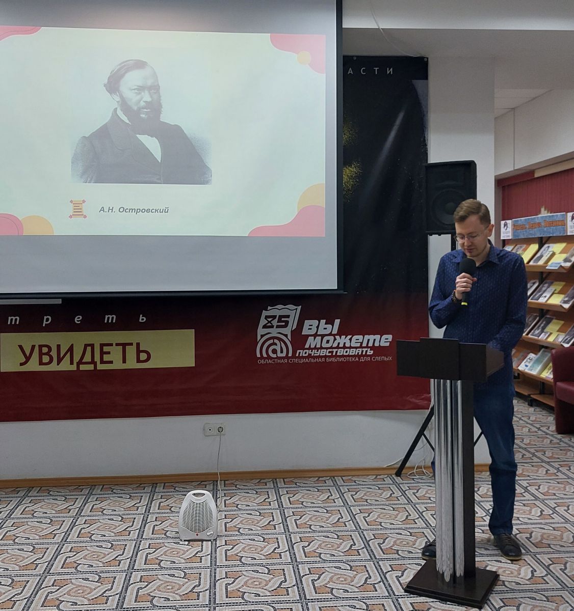 Ведущий мероприятия — заведующий сектором социокультурной реабилитации инвалидов Артем Бондарев рассказал о том, что, помимо писательской деятельности Островский также выступал в качестве театрального деятеля. Писатель оказал значительное влияние на развитие театральной культуры в России. При Островском были сформированы новые подходы к актерской игре: естественность и правдивость стали главными. Изменились декорации, костюмы, зрителей поражала близость к реальной действительности.