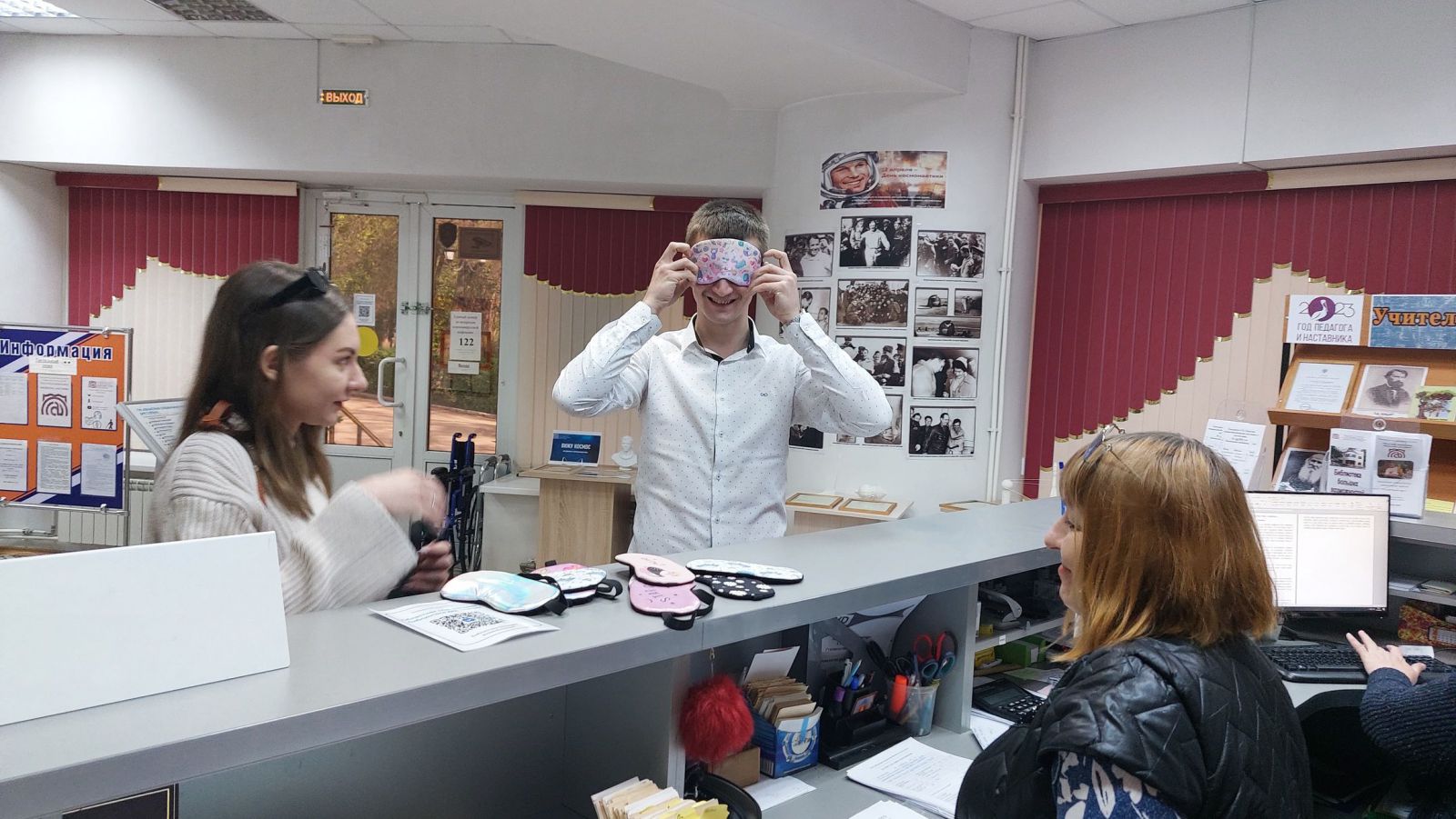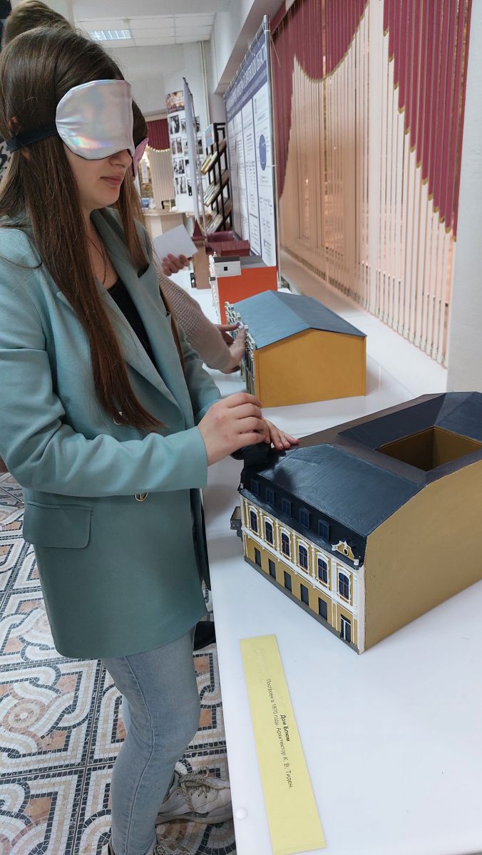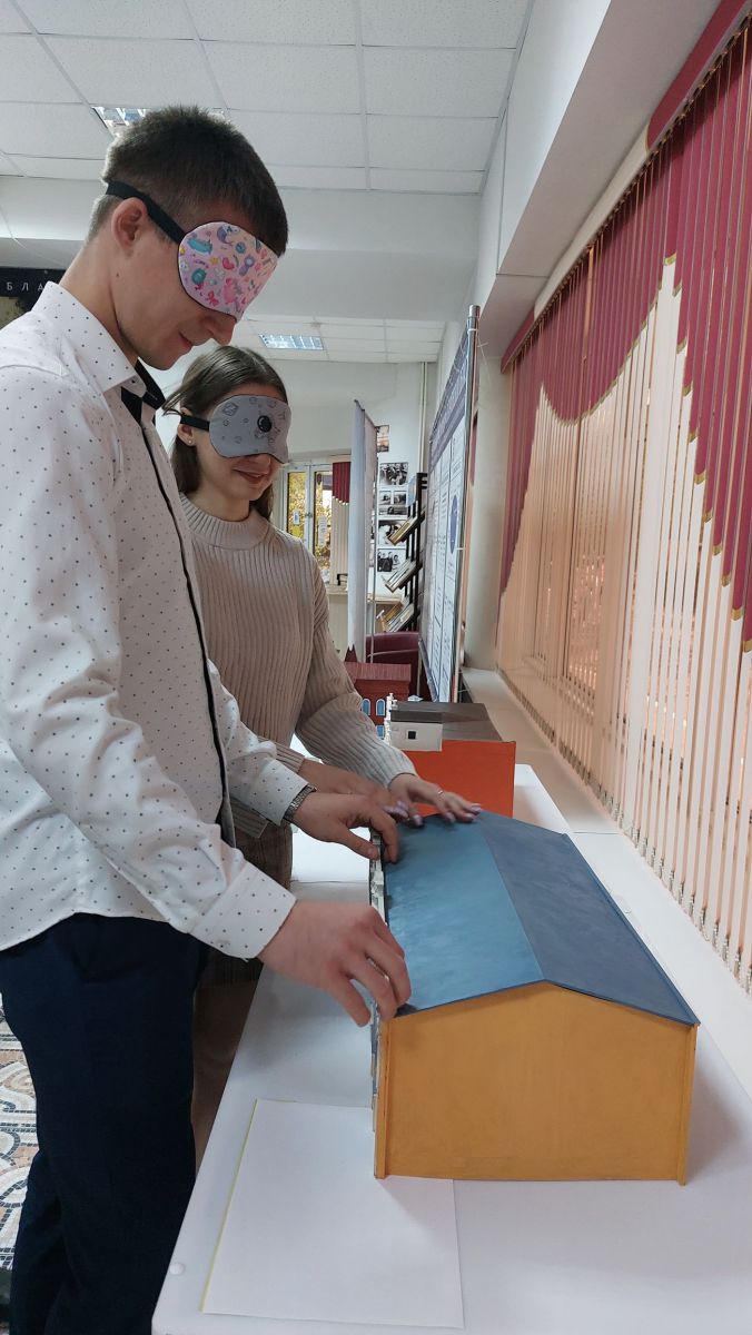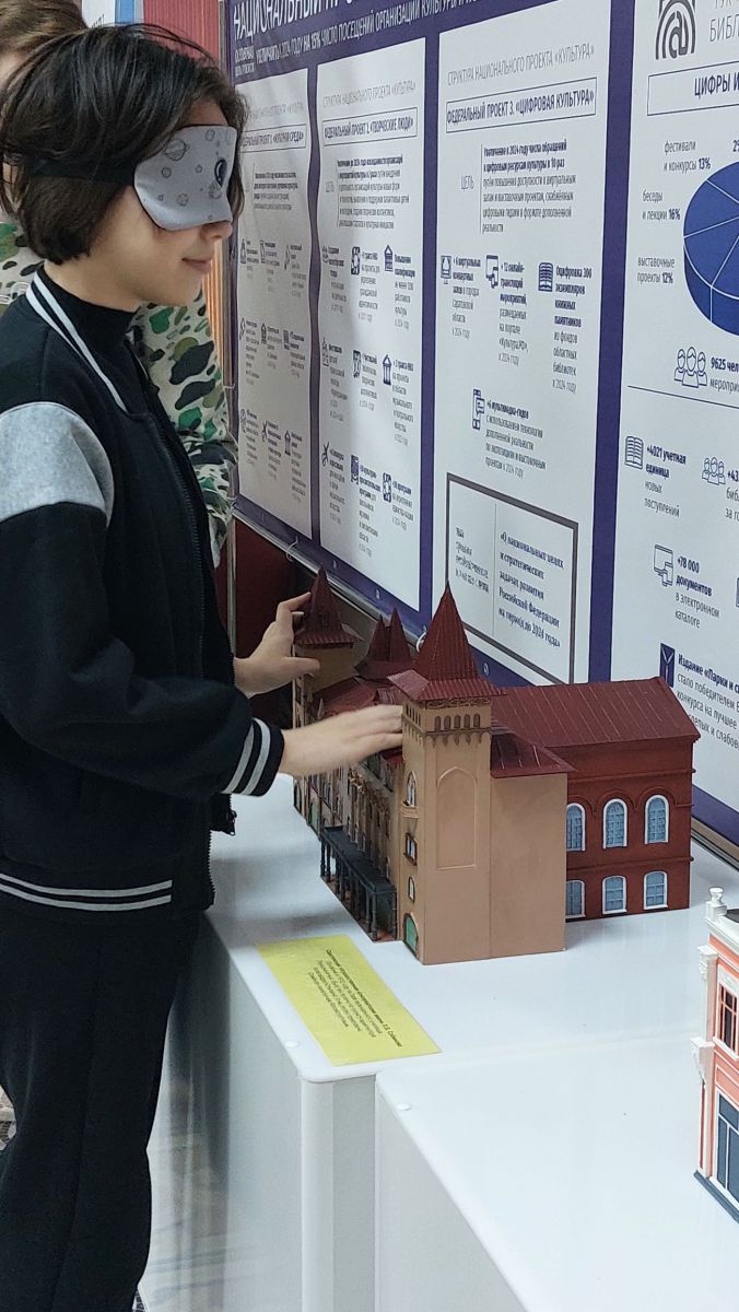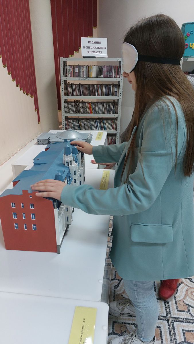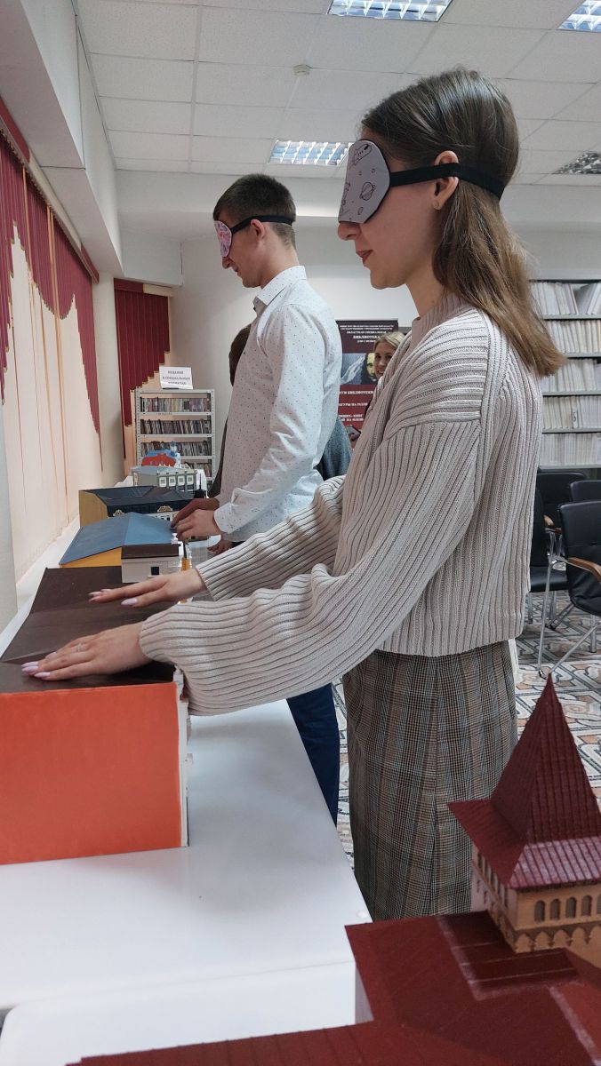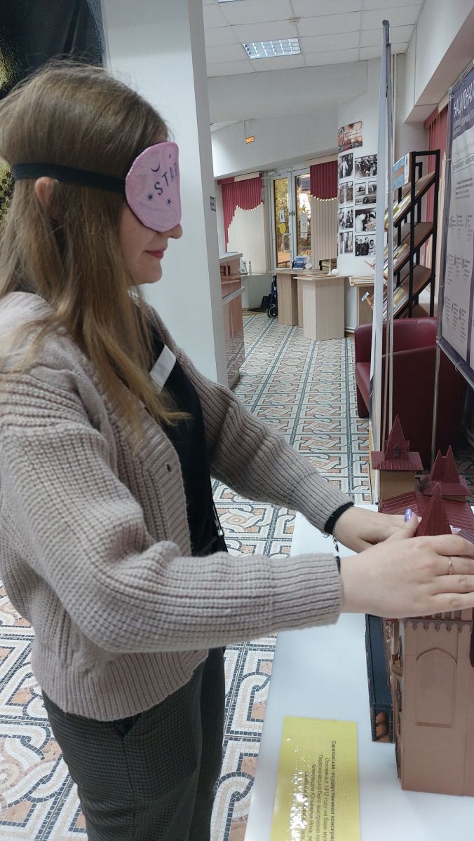 Далее молодым людям, с их согласия, было предложено надеть маски на глаза, и специалисты библиотеки сопроводили ребят в тактильный зал, где была развёрнута выставка «Зримый Саратов». Участникам нужно было поочерёдно определить кончиками пальцев все семь зданий, с которых началась квиз-викторина.