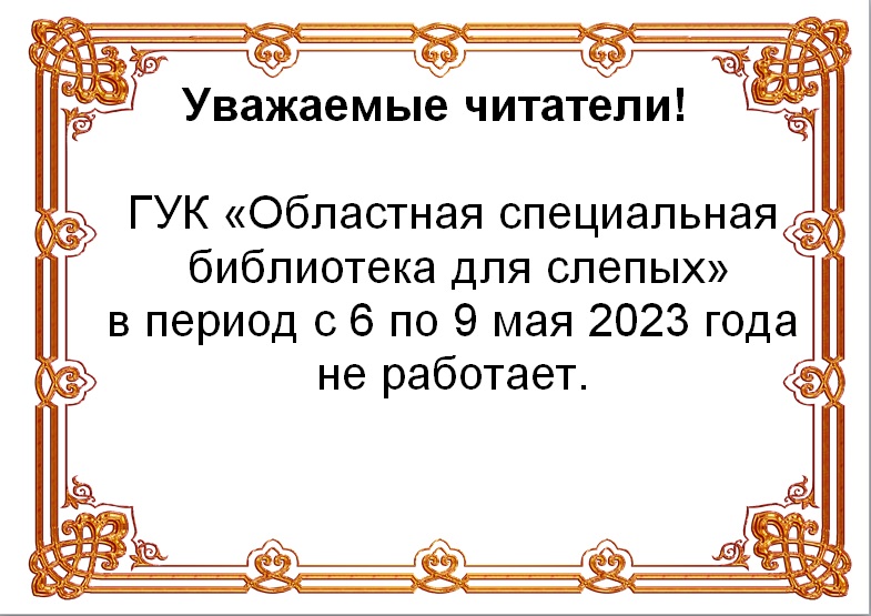 ГУК «Областная специальная библиотека для слепых» в период с 6 по 9 мая 2023 года не работает.