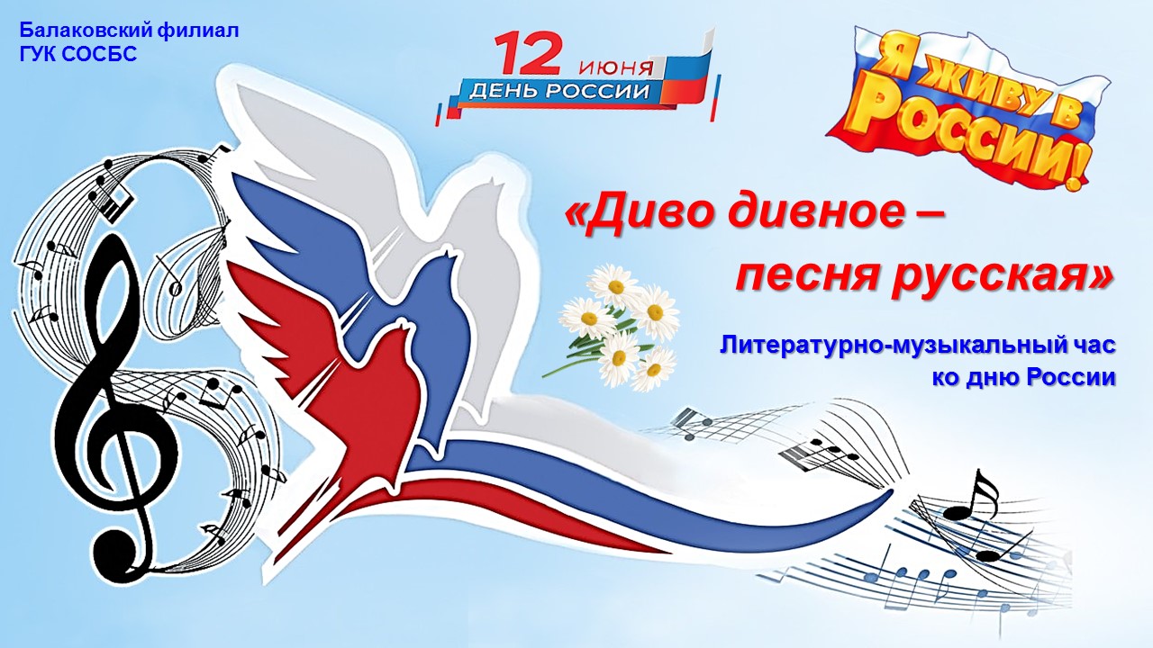 Литературно-музыкальный час «Диво дивное - песня русская» познакомил с историей возникновения праздника День России; напомнил незабываемые страницы многовекового исторического пути России к утверждению независимости и завоеванию позиций сильного государства; рассказал о героях-патриотах и их подвигах. Библиотечная студия «Горячие сердца» подготовила творческую часть мероприятия: прозвучали стихи русских и советских поэтов о России, любви к родному краю, уважении к историческому прошлому нашей страны и песни о Родине, русской земле, дружбе и любви.