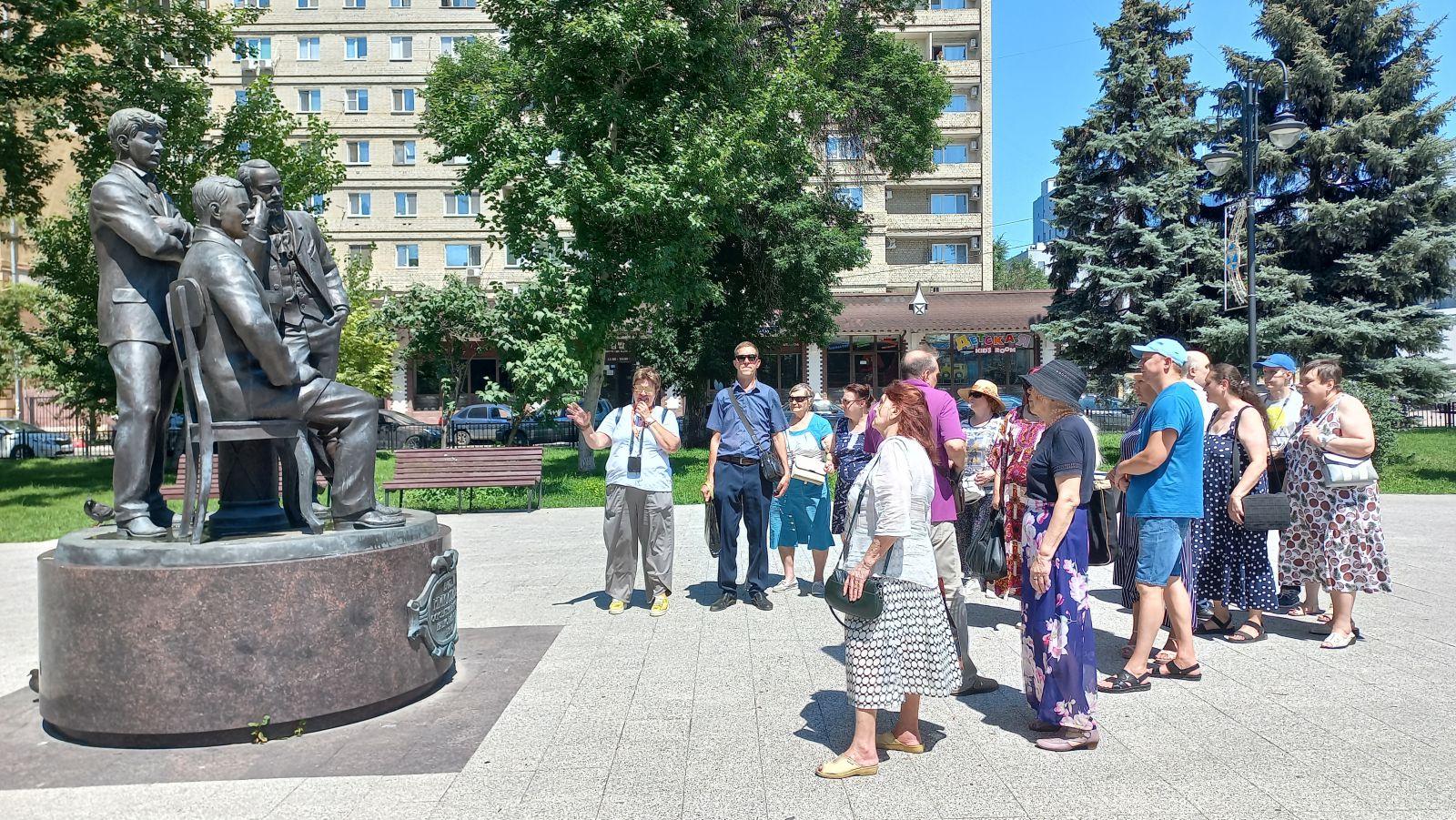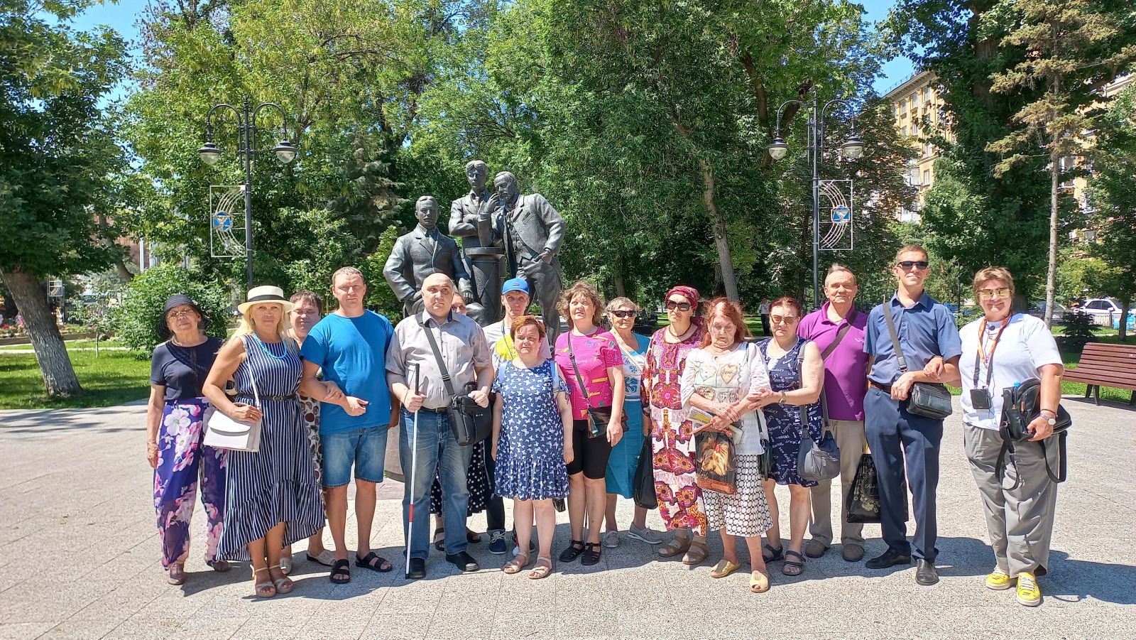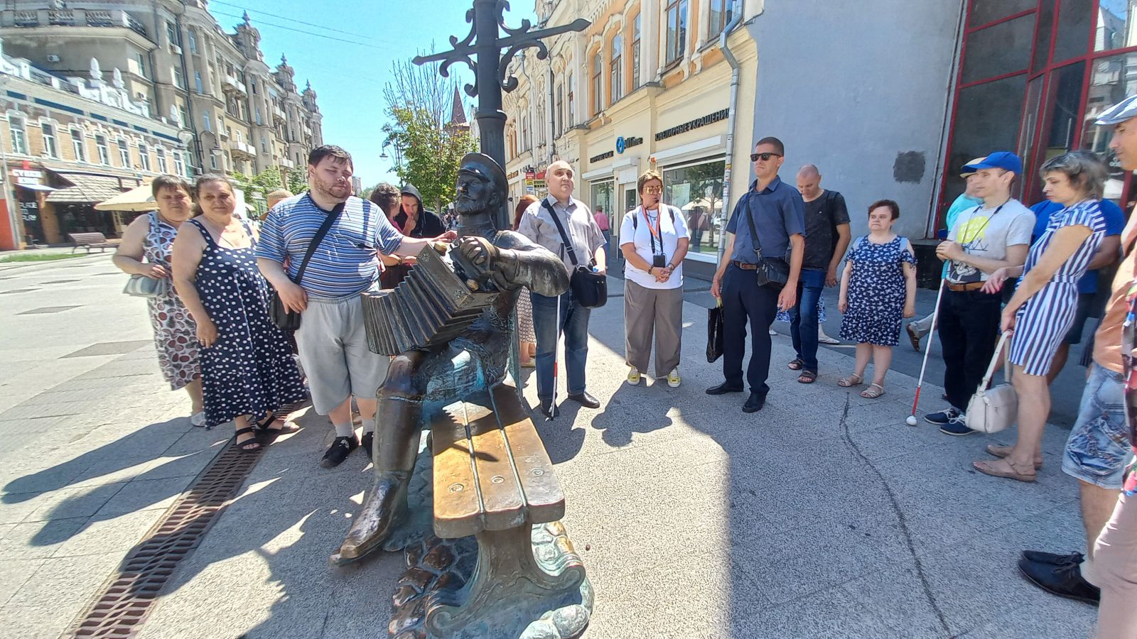 Экскурсия началась у знаменитого памятника Н.Г. Чернышевскому, барельеф которого можно увидеть на выставке «Зримый Саратов». У каждого незрячего был сопровождающий. С большим интересом экскурсанты слушали гида, рассказывающего о разных исторических эпохах, которые объединили в себе историю цирка, купеческий быт, судьбы немцев Поволжья.