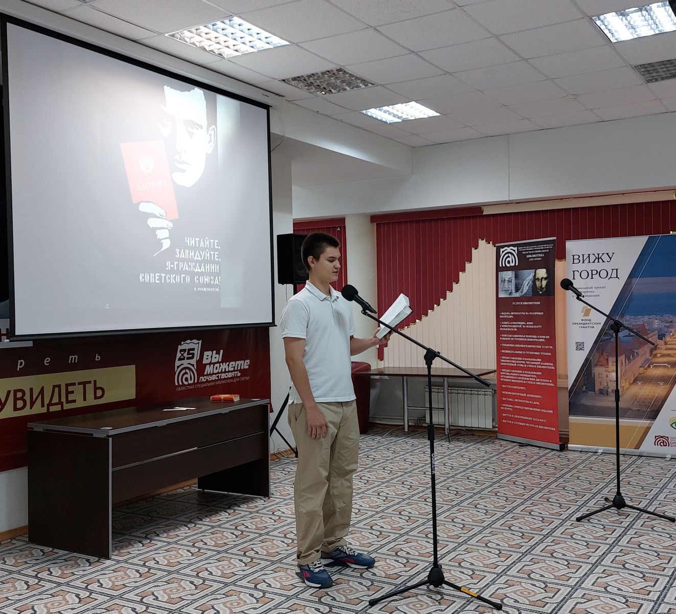 Особо хочется отметить, что в инклюзивном мероприятии приняла участие молодежь. И отрадно, что молодое поколение выбирает в Маяковском то, что ему близко, интересно. Ученик драматического театра «Окна» Иван Самохвалов прочитал отрывок из главы «Взрослое» поэмы «Люблю». Очень актуально и современно прозвучали «Стихи о советском паспорте». Во время прочтения сотрудник библиотеки Виктор Завалишин держал в руках паспорт гражданина Российской Федерации, что добавило особой эмоциональности этому моменту. Молодые люди так проникновенно и вдохновляюще читали, что надолго запомнятся нашим читателям.
