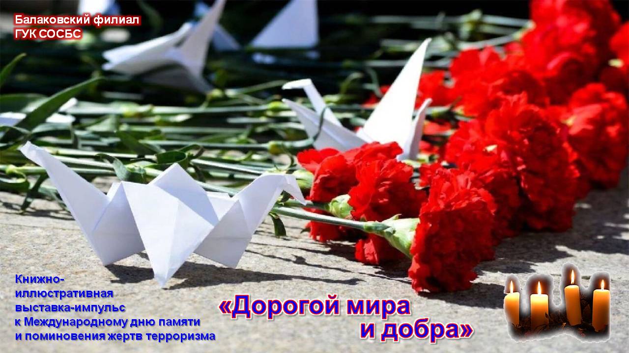 В Балаковском филиале Областной специальной библиотеки для слепых работает книжно-иллюстративная выставка-импульс «Дорогой мира и добра» к Международному дню памяти и поминовения жертв терроризма (в рамках информационного глобуса «За культуру мира, против терроризма!»). Выставка рассказывает о возникновении даты Международного дня памяти и поминовения жертв терроризма, о том, что жертвы терроризма нуждаются в поддержке и защите их прав, о мерах по устранению условий, способствующих распространению терроризма. Художественная и научно-популярная литература (произведения отечественных и зарубежных авторов) на разных носителях знакомит с принципами мирного и благополучного сосуществования людей в разные времена, с перспективами обеспечения национальной стабильности и глобального благополучия в мире.