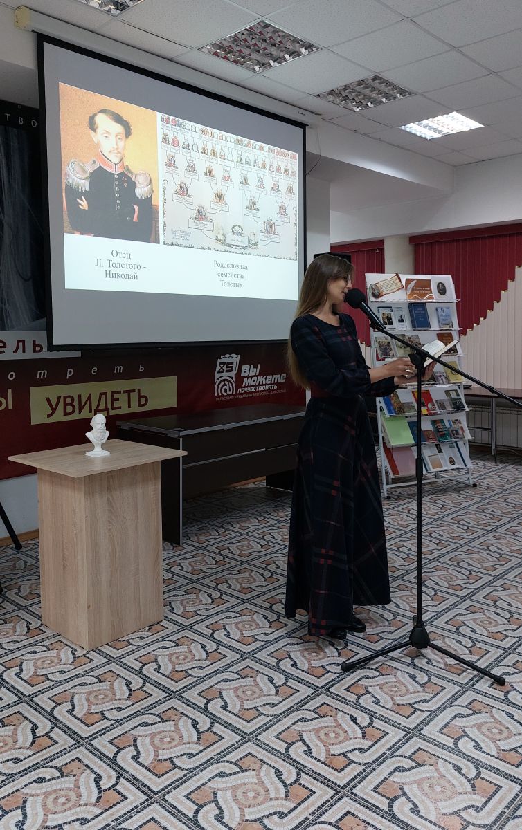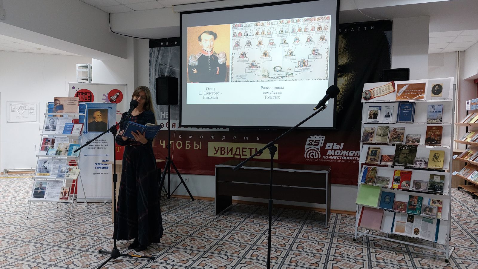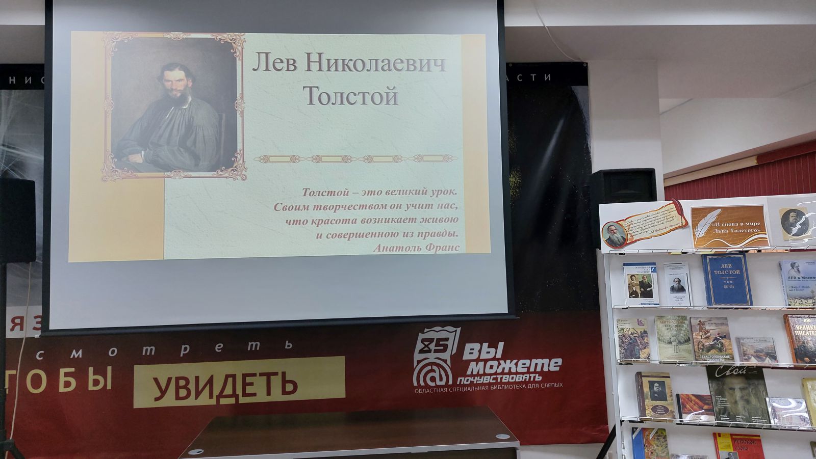 В Областной специальной библиотеке для слепых в рамках литературной гостиной состоялась лекция, посвящённая жизни и творческому пути великого классика. Ведущий мероприятия Артём Бондарев тепло поприветствовал читателей библиотеки. Все подробно узнали о семье, детстве, юности писателя, о знакомстве Толстого с Софьей Берц – будущей женой писателя, о семейном укладе и о детях.