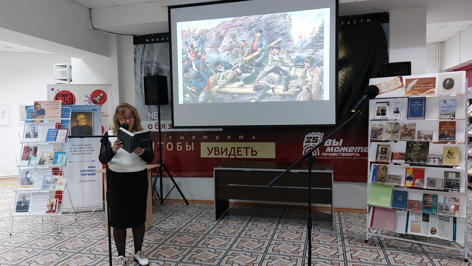 В 1853 году при переводе в Крым он написал: «Будь полезен, сколько ты можешь, Отечеству». Толстой провёл в городе практически всё время до окончания боевых действий, служа артиллеристом на знаменитом четвёртом бастионе. Здесь он встречался с Павлом Нахимовым, Владимиром Истоминым. Все 349 дней он был в Севастополе, где русские моряки и солдаты отстаивали город при численном превосходстве противника и продемонстрировали всему миру свой героизм, мужество и отвагу. Толстой со своей батареей прикрывал отход русских войск через бухту и уходил из города последним. Участник Крымской войны Лев Николаевич Толстой создаёт яркий документ – «Севастопольские рассказы». В них автор показывает точно и детально офицерский и солдатский быт, обмундирование, передаёт живую разговорную речь. Главным в них стала тема солдата и Родины. Правда войны ярко прозвучала в его рассказах. Сотрудник библиотеки Светлана Южакова прочла вслух отрывок из «Севастопольских рассказов», наши читатели узнали, какие мысли и чувства обуревали защитников города.