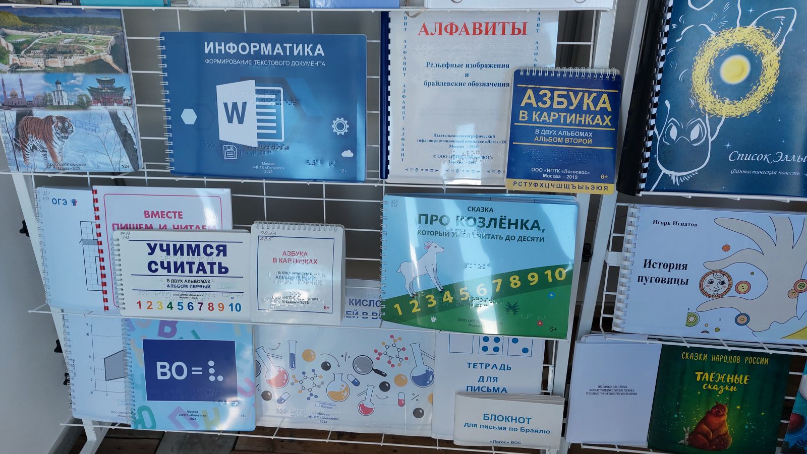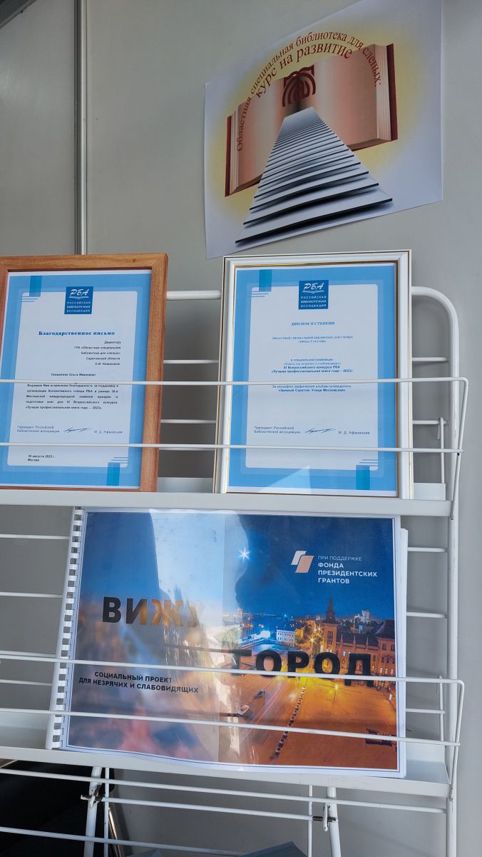 Выставка «Областная специальная библиотека для слепых: курс на развитие» рассказала о достижениях библиотеки. В 2023 году библиотека стала призёром XI Всероссийского конкурса Российской библиотечной ассоциации «Лучшая профессиональная книга года – 2023», заняв второе место в специальной номинации «Книги для незрячих и слабовидящих» - на выставке представлен многоформатный альбом-победитель «Зримый Саратов: улица Московская», знакомящий читателей с проблемами зрения с достопримечательностями одной из главных улиц города Саратова. Вниманию посетителей выставки также представлены многоформатные альбомы «Проспект имени Петра Столыпина», «Оружие Победы». Эти издания позволяют читателям с ограничениями зрения совершить прогулку по знаковым улицам нашего города, познакомиться с его достопримечательностями в доступном для них формате.