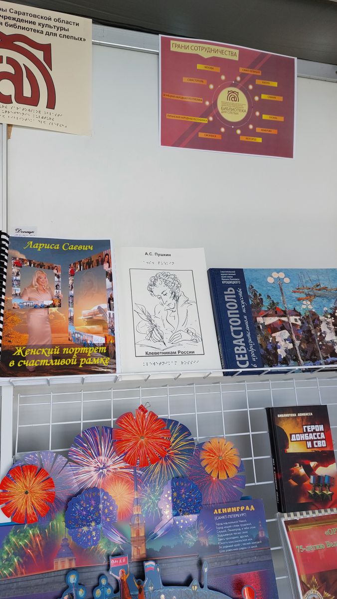 Выставка «Грани сотрудничества» рассказала о творческом взаимодействии нашей библиотеки с организациями-партнёрами. Одна из тем – «Донбасс и СВО». На выставке представлен сборник стихов поэта Донецкой Народной Республики Ларисы Саевич «Женский портрет в счастливой рамке». Сборник издан рельефно-точечным шрифтом Брайля отделом издательских и медиатехнологий Областной специальной библиотеки для слепых в 2023 году. Экземпляры книги в специальном формате уже доставлены в Донецкую республиканскую универсальную научную библиотеку им. Н.К. Крупской.