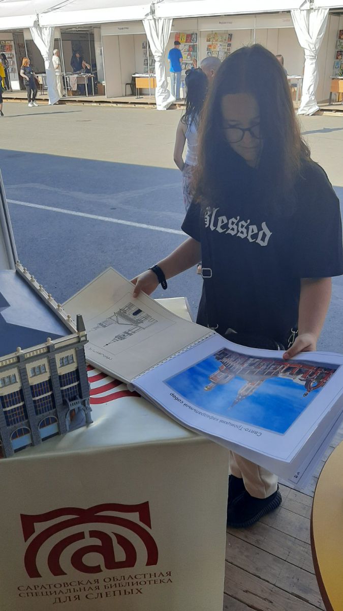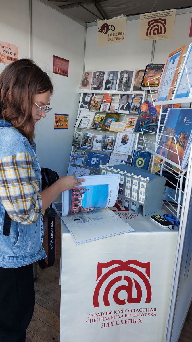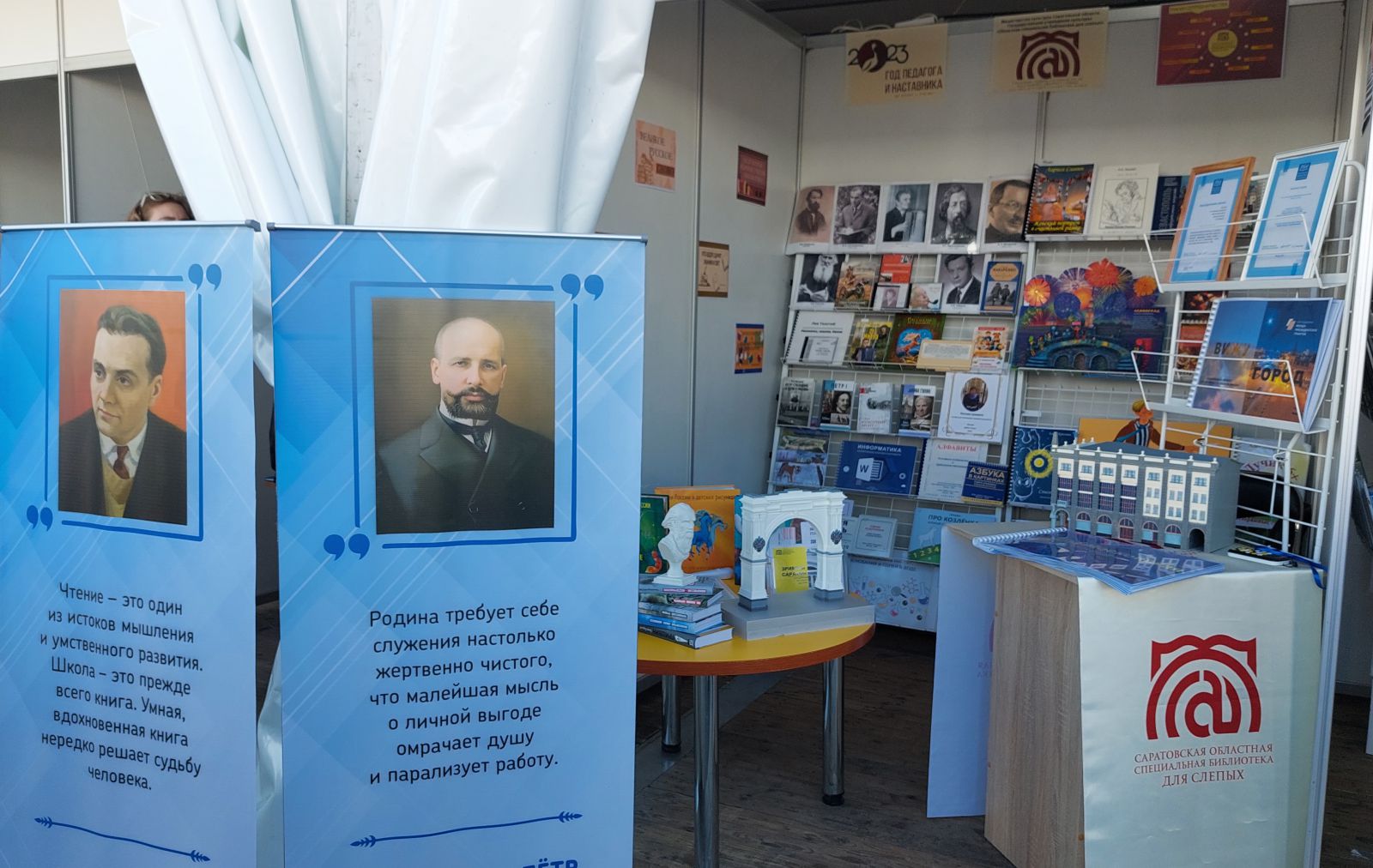 ГУК «Областная специальная библиотека для слепых» приняла участие в IX Международной книжной ярмарке-фестивале «Волжская Волна – 2023» (21 – 24 сентября). Ярмарка традиционно стала одним из самых ярких культурных событий года в Саратове. Библиотека презентовала проекты к Году педагога и наставника – «Образ учителя в художественной литературе», «Кто щедро дарит знания и свет», «Заслуженные незрячие учителя РСФСР», издания в специальных форматах для незрячих и слабовидящих по тематике года: рельефно-графические пособия, издания рельефно-точечным шрифтом Брайля, аудиокниги. Отдельное место уделено классикам педагогики: Константину Ушинскому, Антону Макаренко, Василию Сухомлинскому. Особое место занимает краеведческий раздел, рассказывающий о педагогах-наставниках в театральной и культурной сфере: актёре, режиссёре, народном артисте СССР Олеге Табакове; актрисе, режиссёре, сценаристе, театральном педагоге, заслуженном работнике культуры РСФСР Наталии Сухостав; незрячем баянисте, композиторе, заслуженном артисте РСФСР Иване Яковлевиче Паницком.