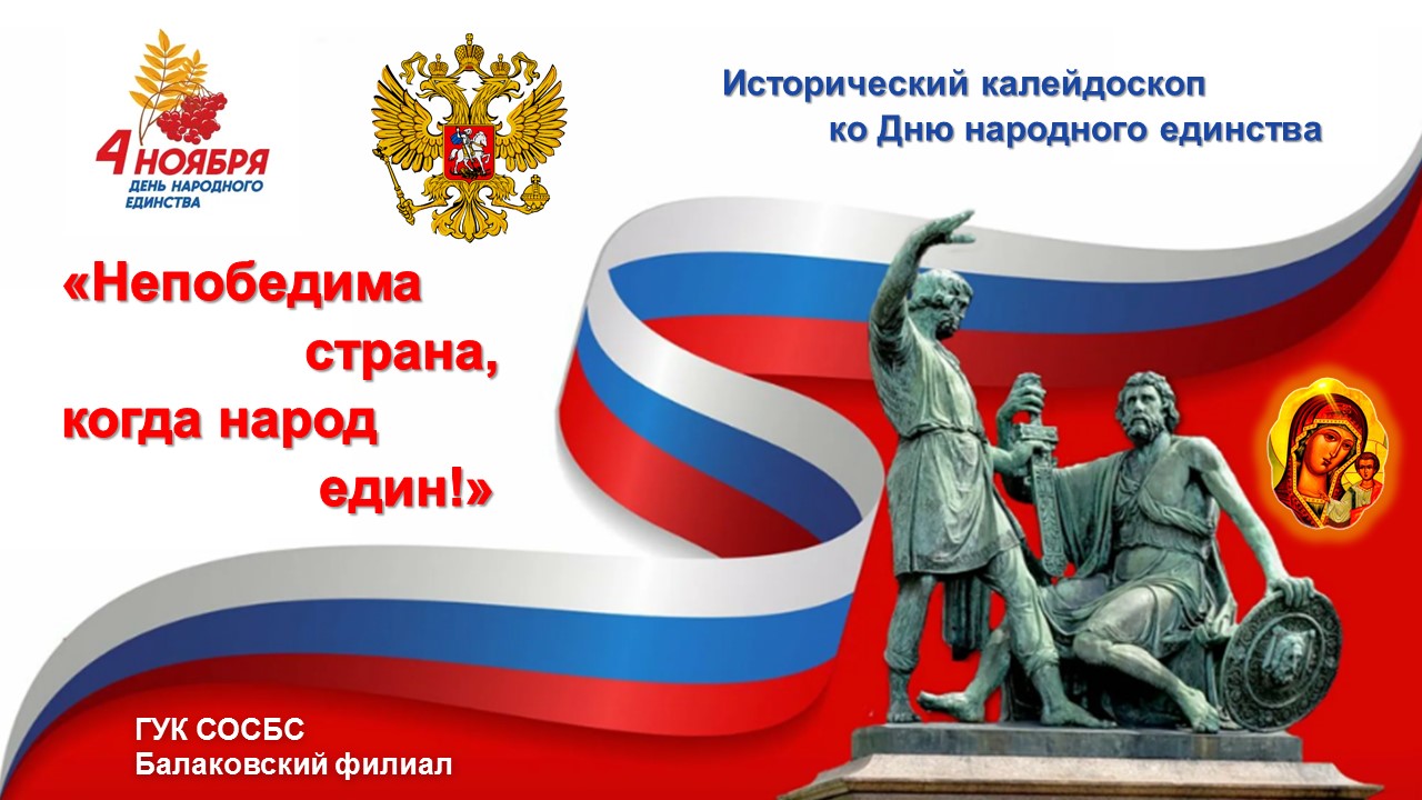 Балаковский филиал Областной специальной библиотеки для слепых подготовил для своих читателей исторический калейдоскоп, посвящённый Дню народного единства. Мероприятие рассказало о появлении праздника Дня народного единства, о его значении; о подвиге русского народа, сплотившегося для освобождения России от интервентов и захватчиков; о великом русском князе Дмитрии Пожарском и национальном герое Кузьме Минине. Тематическая викторина предоставила возможность проверить свои познания о далеких героических страницах истории нашей страны.