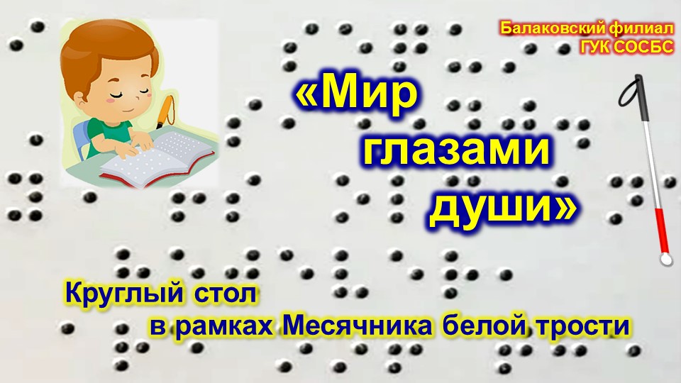 Балаковский филиал Областной специальной библиотеки для слепых подготовил для учащихся МАОУ СОШ №7 г. Балаково круглый стол в рамках Месячника белой трости. Ребята узнали историю возникновения Дня Белой трости, о том, как живут незрячие, о создателях системы чтения и письма для слепых Валентине Гаюи и Луи Брайле, о людях, которые своим упорством и любовью к жизни смогли реализоваться в обществе в различных областях, добились огромных успехов и обрели мировую славу.