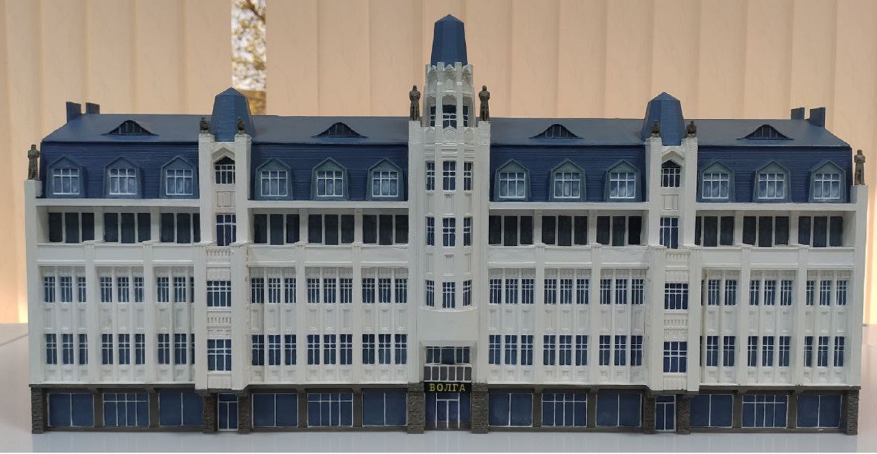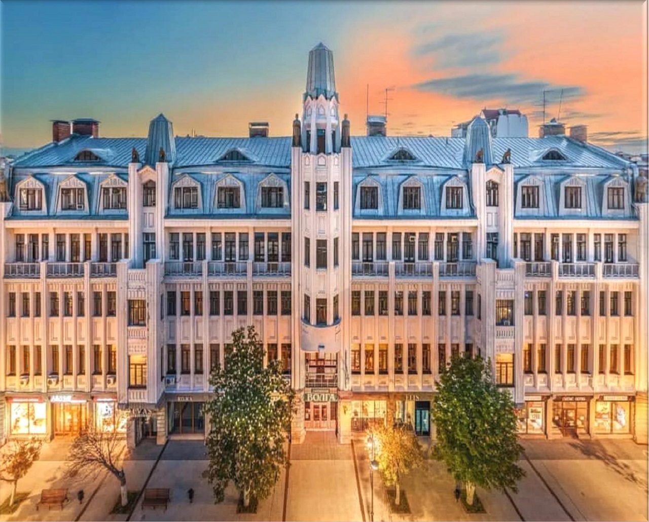 В середине XIX века на улице Немецкой (ныне проспект им. Петра Столыпина), между улицей Вольская и улицей Александровской (ныне улица Горького) стоял длинный одинокий особняк с мезонином князя Куткина. В 1911 году купцом I гильдии Д.В. Тихомировым это здание было выкуплено с целью построить на этом месте гостиницу. После оформления нужных бумаг и получения солидного кредита Д.В. Тихомиров начал здесь строительство крупной гостиницы. Первый камень был заложен весной 1914 года. Проект гостиницы, названной «Астория», подготовил архитектор Семен Акимович Каллистратов. К осени 1917 года возведение отеля завершилось. В 1956 году название гостинице заменили. Она стала называться «Волга». Недавно отель был переоборудован с учетом современных требований комфорта. Здание выполнено в стиле позднего модерна, имеет строго геометрические линии. Здание украшают пилоны (башнеобразные сооружения), на которых застыли парные фигуры средневековых рыцарей и гонцов. Автором скульптур являлся преподаватель Боголюбовского рисовального училища скульптор Николай Петрович Волконский. Здание имеет 5 этажей, балконы. В четких линиях, в торжественном ритме и величавом силуэте здания гостиницы «Астория», нынешней «Волги», руками прекрасных мастеров сложена последняя рифма баллады о переселенцах. | ![]()