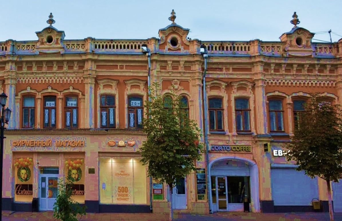 Первым владельцем этого дома в 1890-е годы, стал Фёдор Яковлевич Дружинин, предприниматель в сфере торговли недвижимостью. Сначала в этом доме находилось «Уездное по питейным делам присутствие», а позже, в 1898 году, был открыт роскошный магазин, в котором производилась торговля гастрономическими, бакалейными и кондитерскими товарами. Владельцем этого магазина до 1912 года был Александр Эрастович Смирнов, муж дочери Дружинина Анфисы Фёдоровны.