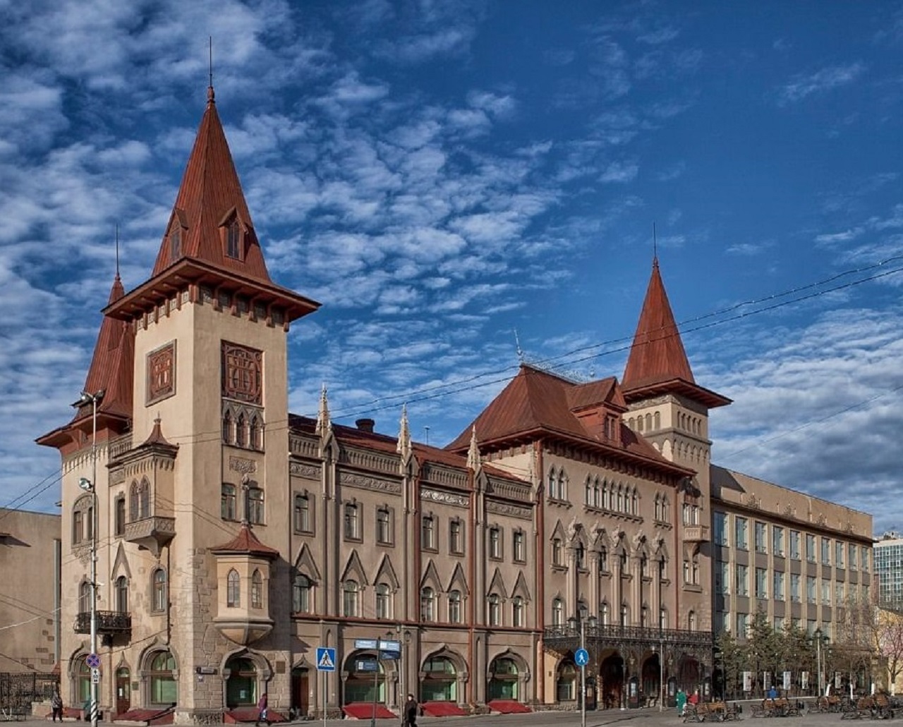 Взлёт фантазии помог петербургскому зодчему выиграть на пороге ХХ века конкурс проектов необычного дома, объединившего под общей крышей музей и кинозал, сцену и библиотеку. Прежде всего, архитектор пренебрег незыблемым принципом симметрии, изначальной правильности, заданности внешнего вида здания – пристройки и надстройки, выступы ризалитов (часть здания, выступающая за основную линию фасада и идущая во всю высоту здания), балконы и окна группируются вокруг главных объёмов – залов библиотеки. Сложный внешний объём сооружения вырастает изнутри. С самого начала мнение о здании разделилось: одни считали, что это самое смелое архитектурное сооружение города, поражающее своими красивыми ломаными линиями и разнообразными по величине и форме окнами. Ассиметричное оригинальное здание в центре города бордового цвета привлекает внимание горожан и в наше время.