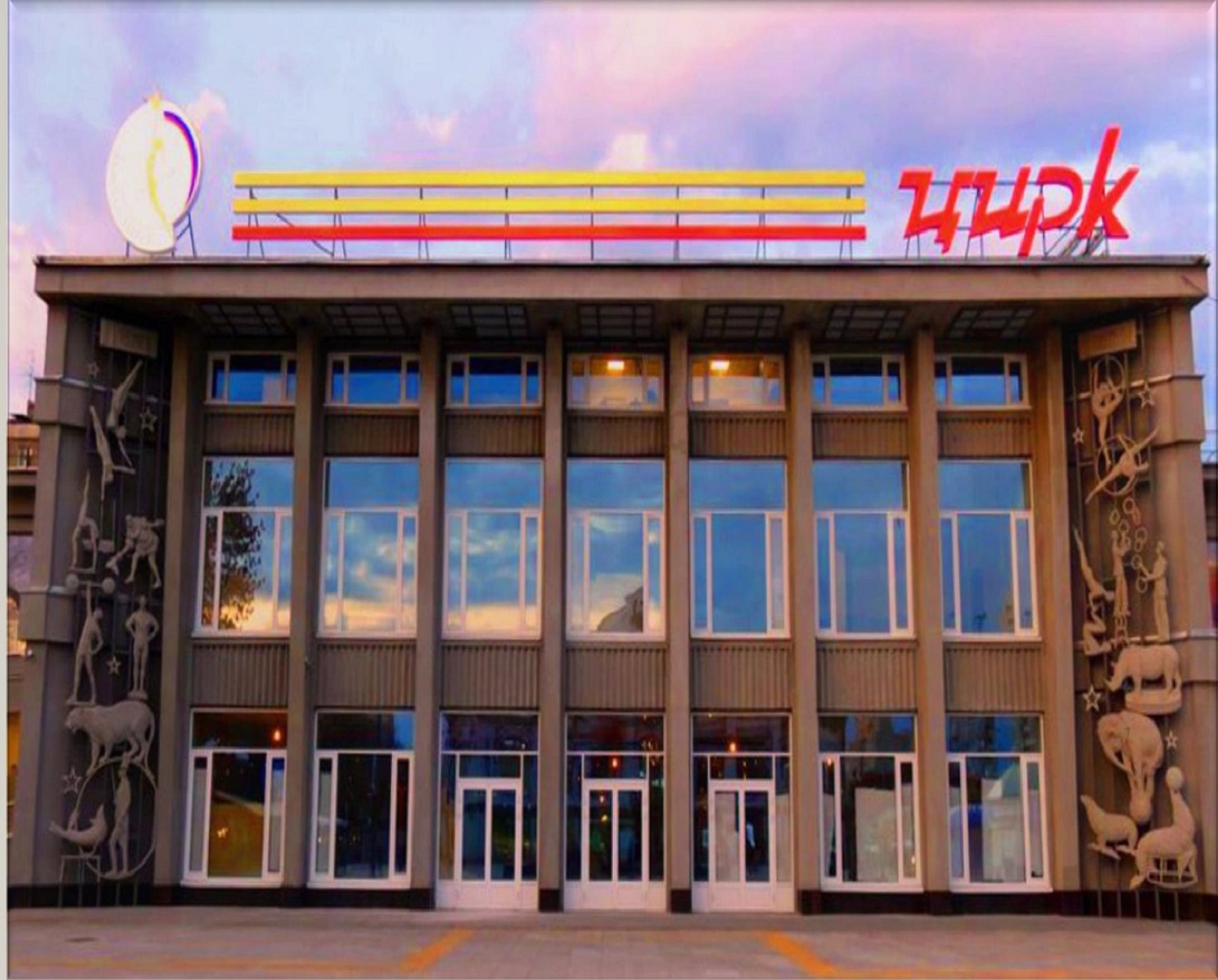 Обратим внимание на фасад здания. Он имеет прямоугольную форму, по центру его возвышается верхняя часть купола. На крыше здания, справа, красуется красная надпись «Цирк». Само здание имеет серый цвет. На переднем фасаде — три ряда окон с затемнением. В первом ряду находится три больших входа.