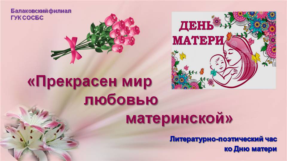 Балаковский филиал Областной специальной библиотеки для слепых подготовил для своих читателей - участников клуба молодых инвалидов «Белая ворона» комплексного центра социального обслуживания населения - литературно-поэтический час ко Дню матери «Прекрасен мир любовью материнской», посвященный Дню матери. Мероприятие рассказало об истории и традициях празднования Дня матери в России и мире, предложило вспомнить образы матерей в литературе, а также стихи и песни, им посвященные.