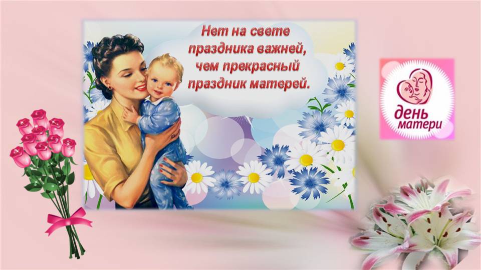 За прошедшие годы День матери стал одним из любимейших российских праздников. Каждый год в последнее воскресенье ноября принято поздравлять мам и бабушек, воздавая должное материнскому труду и бескорыстной жертве матерей ради блага своих детей. День Матери - это тёплый, сердечный праздник. Маму не заменит никто и никогда. И сколько бы хороших, добрых слов мы не говорили нашим матерям, все равно этого будет мало. Для каждого из нас она - единственная на свете, самый любимый человек в целом мире.