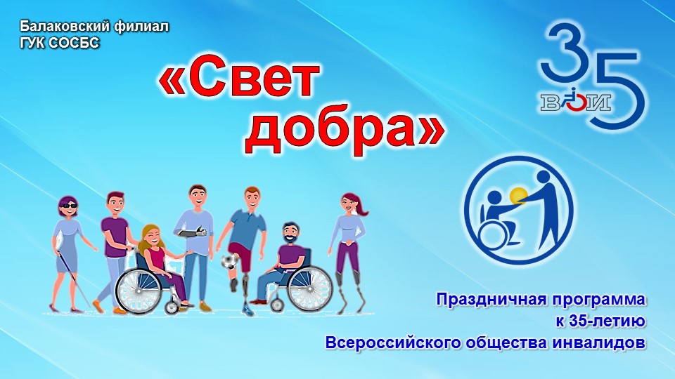 В большом зале МАУК «Дворец культуры» г. Балаково в преддверии Международного дня инвалидов и 35-летия Всероссийского общества инвалидов и БМО ВОИ прошло торжественное мероприятие. Участники праздничной программы «Свет добра» напомнили всем о необходимости доброты и понимания в нашем современном мире, о важности гуманного и заботливого отношения к инвалидам, об оказании им посильной помощи и моральной поддержки.
