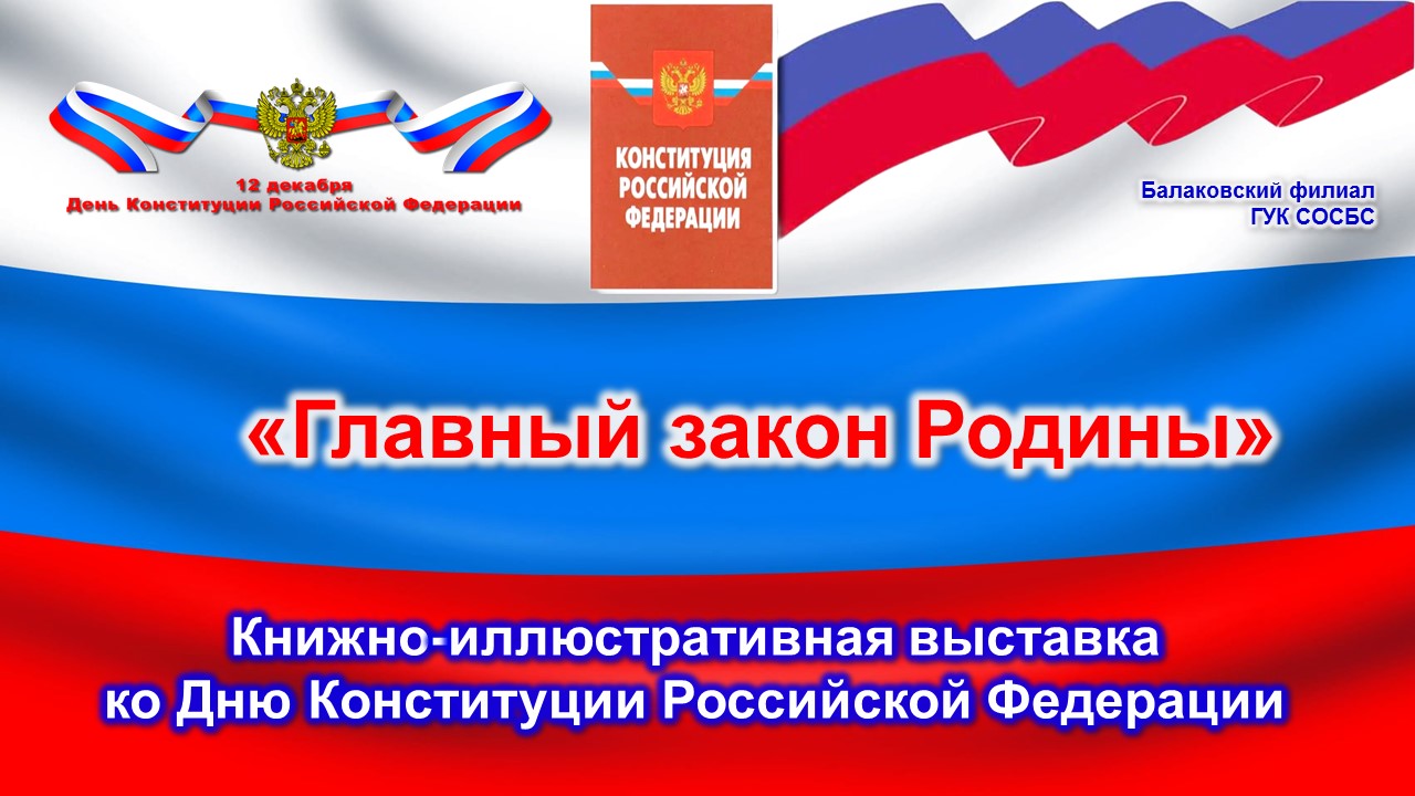 В Балаковском филиале Областной специальной библиотеки для слепых работает книжно-иллюстративная выставка, посвящённая Дню Конституции Российской Федерации. На выставке «Главный закон Родины», рассчитанной на широкий круг читателей, представлена литература (книги, энциклопедии и другие справочные издания) на разных носителях и разных форматов о Конституции Российской Федерации, главных символах нашей Родины, конституционном праве, истории создания основного закона государства, правах человека.