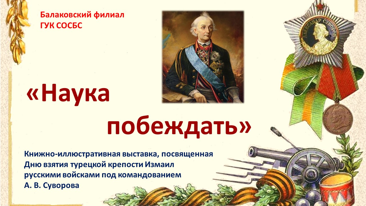 В Балаковском филиале Областной специальной библиотеки для слепых работает книжно-иллюстративная выставка «Наука побеждать». Выставка рассказывает о Дне воинской славы России - Дне взятия турецкой крепости Измаил русскими войсками под командованием А. В. Суворова; представляет литературу разных форматов и на разных носителях об одном из самых успешных сражений русского оружия – о штурме неприступной турецкой крепости Измаил в конце русско-турецкой войны 1787-1791 годов.