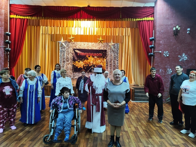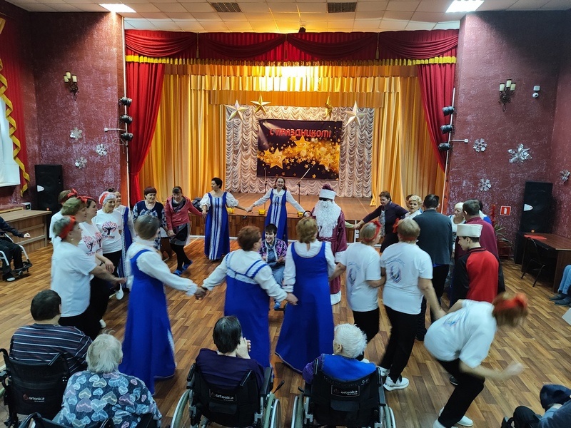 Поздравить проживающих пришел сам Дедушка Мороз, вместе с которым артисты и проживающие дома-интерната под песню «Маленькой елочке холодно зимой» закружились в дружном хороводе, а также поиграли в импровизированные бумажные снежки, в каждом из которых был спрятан маленький сюрприз.