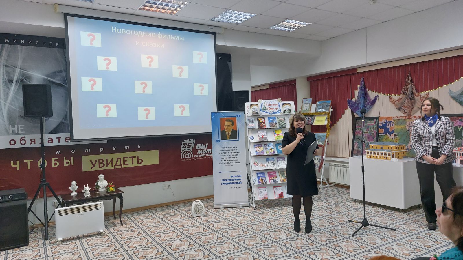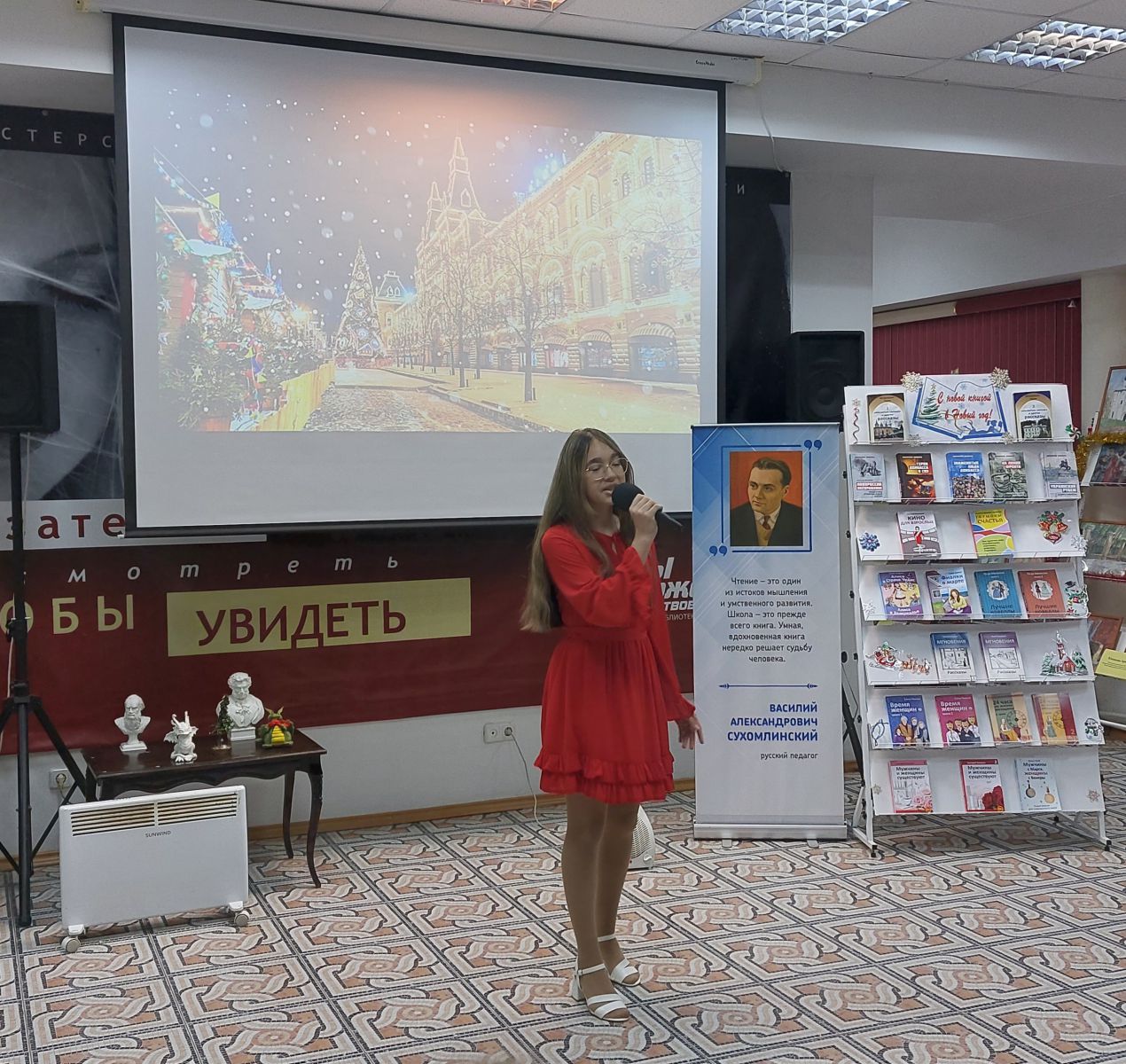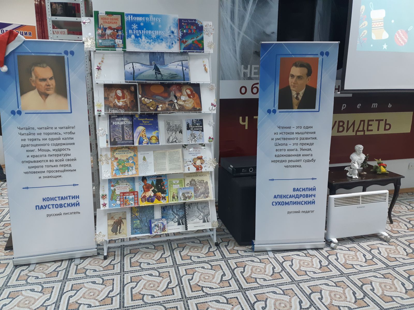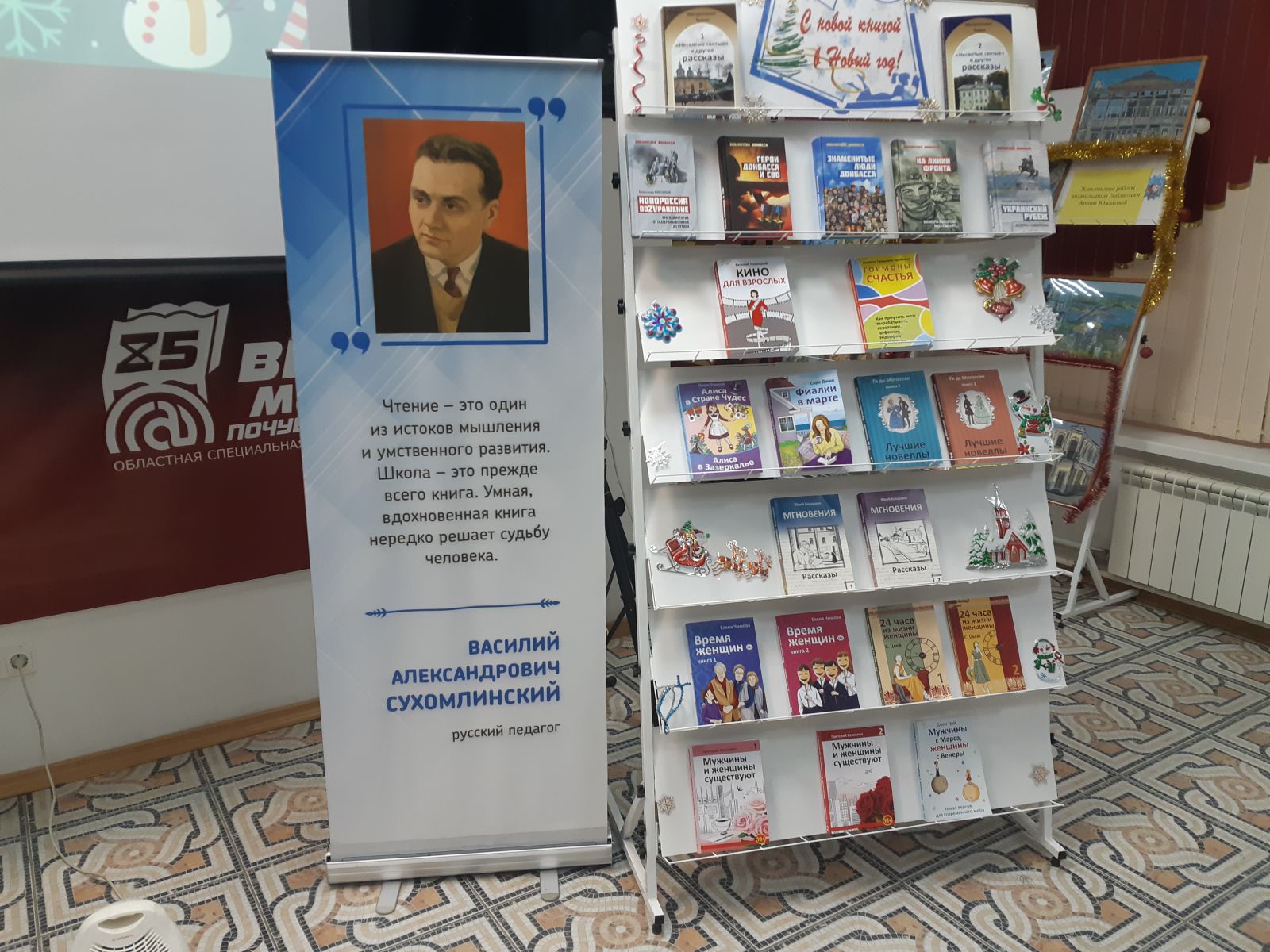 В холле библиотеки атмосферу Нового года и Рождества создавали книжные выставки: «Выставка-настроение», «Выставка-сказка», «В новый год с новой книгой», «Новогоднее вдохновение». Выставки предлагают окунуться в атмосферу сказочного праздника, в череду ярких изданий с новогодними волшебными сказками, веселыми стихотворениями, рассказами известных поэтов и писателей, посвященных зиме. Литература представлена как в специальных, так и в плоскопечатных форматах.