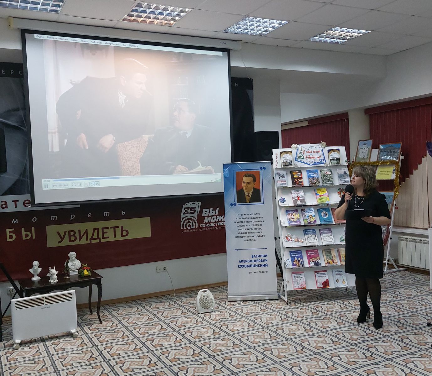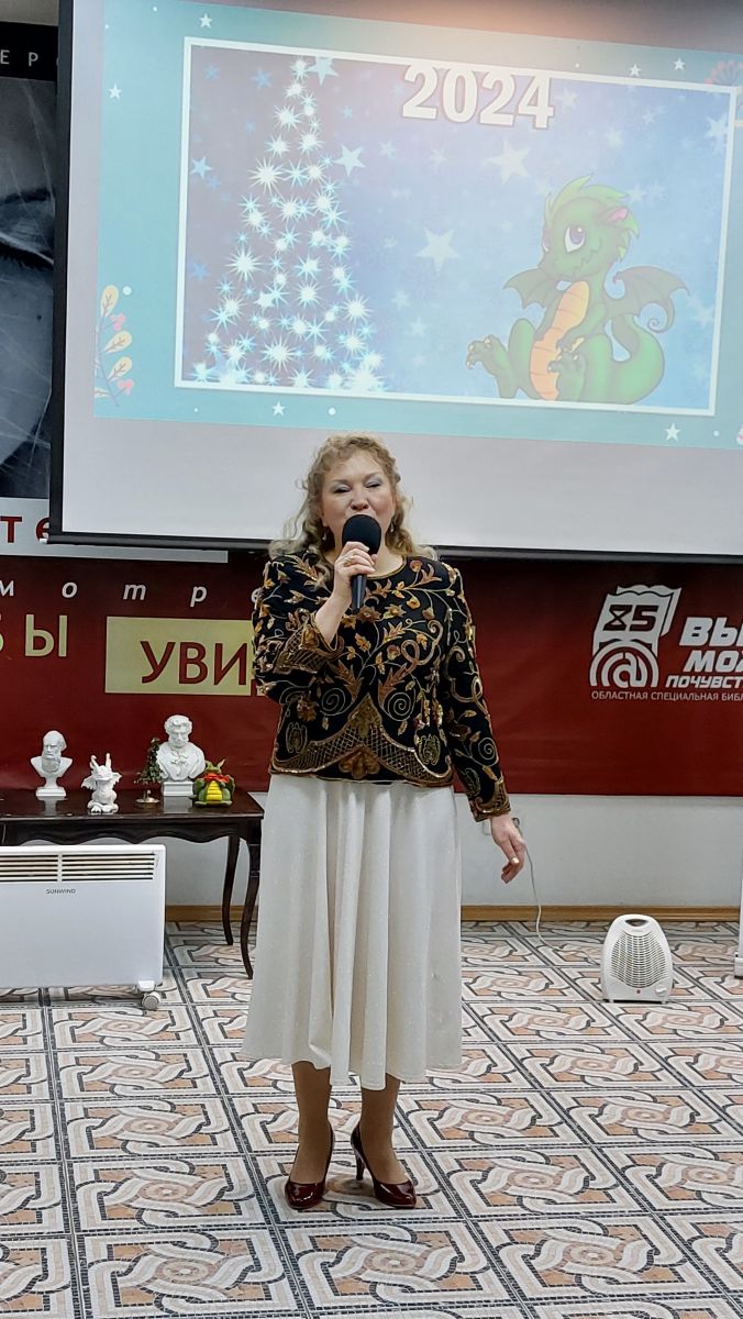 Директор библиотеки Ольга Новикова коротко подвела итоги работы Областной специальной библиотеки для слепых и её филиалов. Отметила самые значимые события 2023 года. Пожелала от имени коллектива мира, благополучия и здоровья, и новых книжных друзей в Новом году.