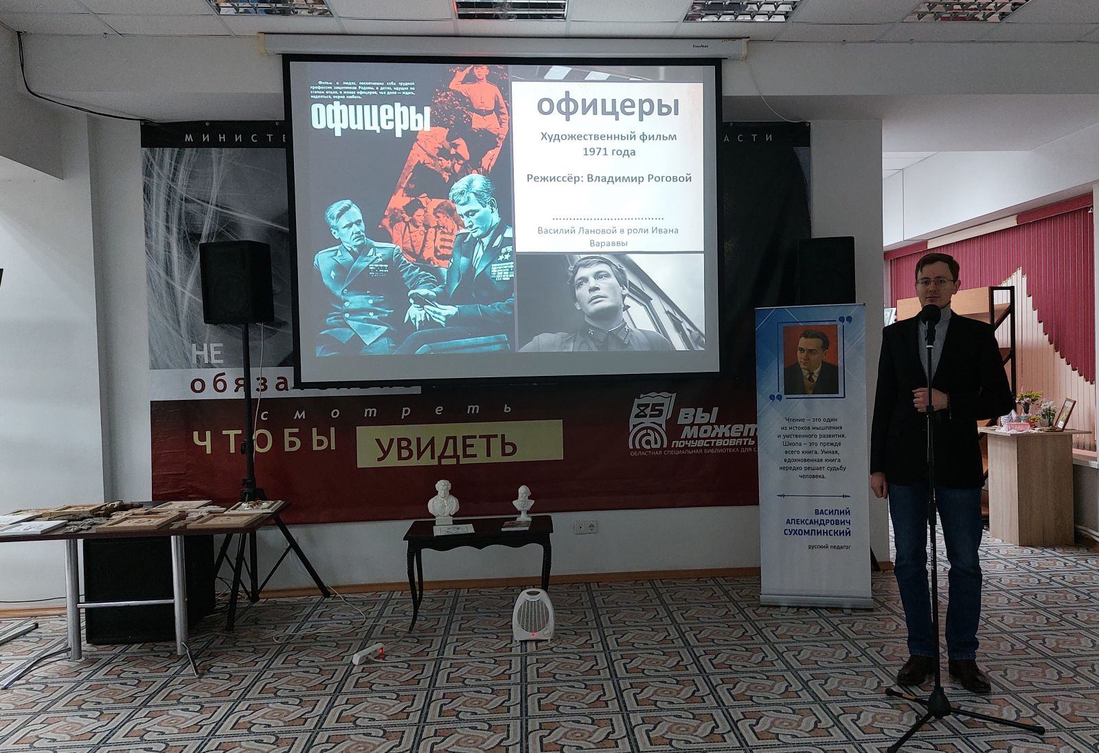 В ходе мероприятия читатели познакомились с его первыми ролями в кино и театре, интересными моментами и случаями, связанными со съемками. Были показаны отрывки из фильмов с тифлокомментариями «Офицеры», «Анна Каренина». На вечере прозвучали интервью Василия Ланового о съемках фильма «Анна Каренина», отрывки из спектаклей и концертов с участием актера. Отдельно остановились на роли в фильме «Павел Корчагин». Особенно читателей заинтересовало, как актеру удалось передать образ незрячего героя в киноленте. Славу актеру принесла работа в эпической картине «Офицеры». Василий Семенович сыграл здесь благородного и мужественного офицера Ивана Варавву. Эта лента до сих пор любима зрителями.